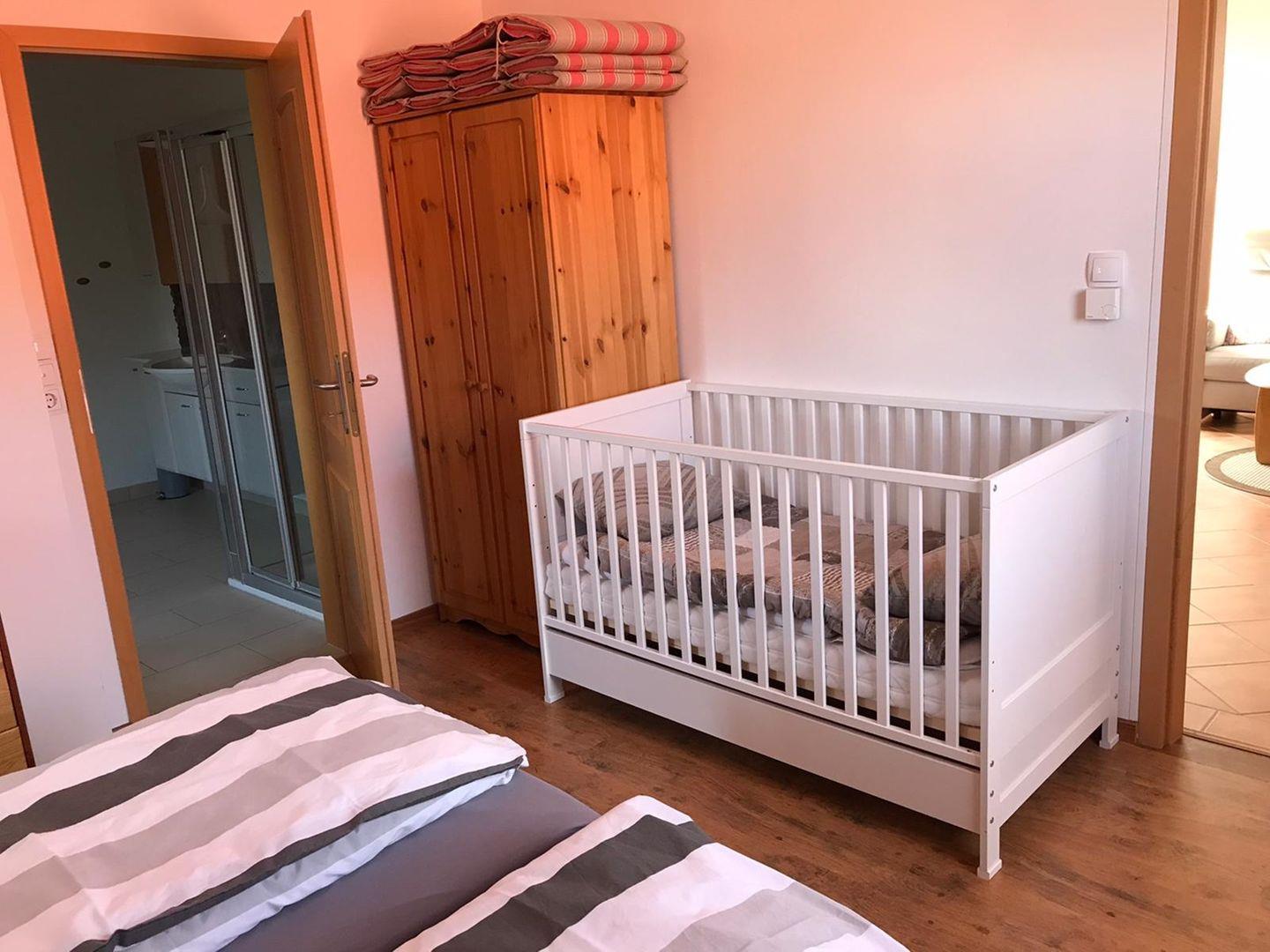 Das Schlafzimmer ist mit einem hochwertigen Boxspringbett ausgestattet, das Ihnen erholsamen Schlaf garantiert. Für Familien mit kleinen Kindern stehen ein Kindergitterbett und ein Hochstuhl zur Verfügung, sodass sich auch die jüngsten Gäste rundum wohlfühlen. Das moderne Badezimmer bietet ein WC, eine Dusche und eine Badewanne – perfekt für entspannte Stunden nach einem erlebnisreichen Tag.