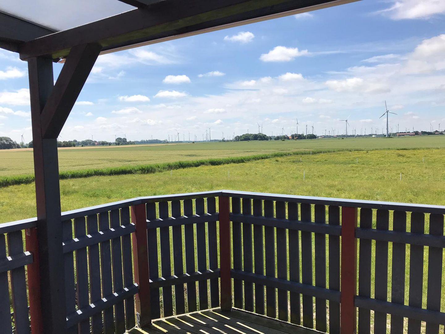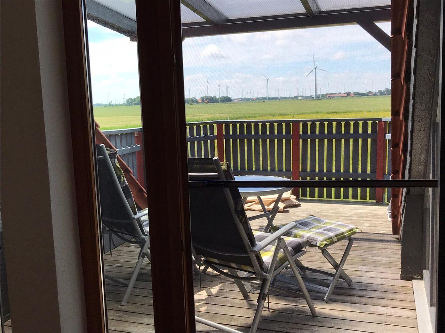 Die Ferienwohnung Dreimaster W2 in Dornumersiel bietet Ruhe, modernen Komfort und einen Balkon mit freiem Blick auf Wiesen und Felder.