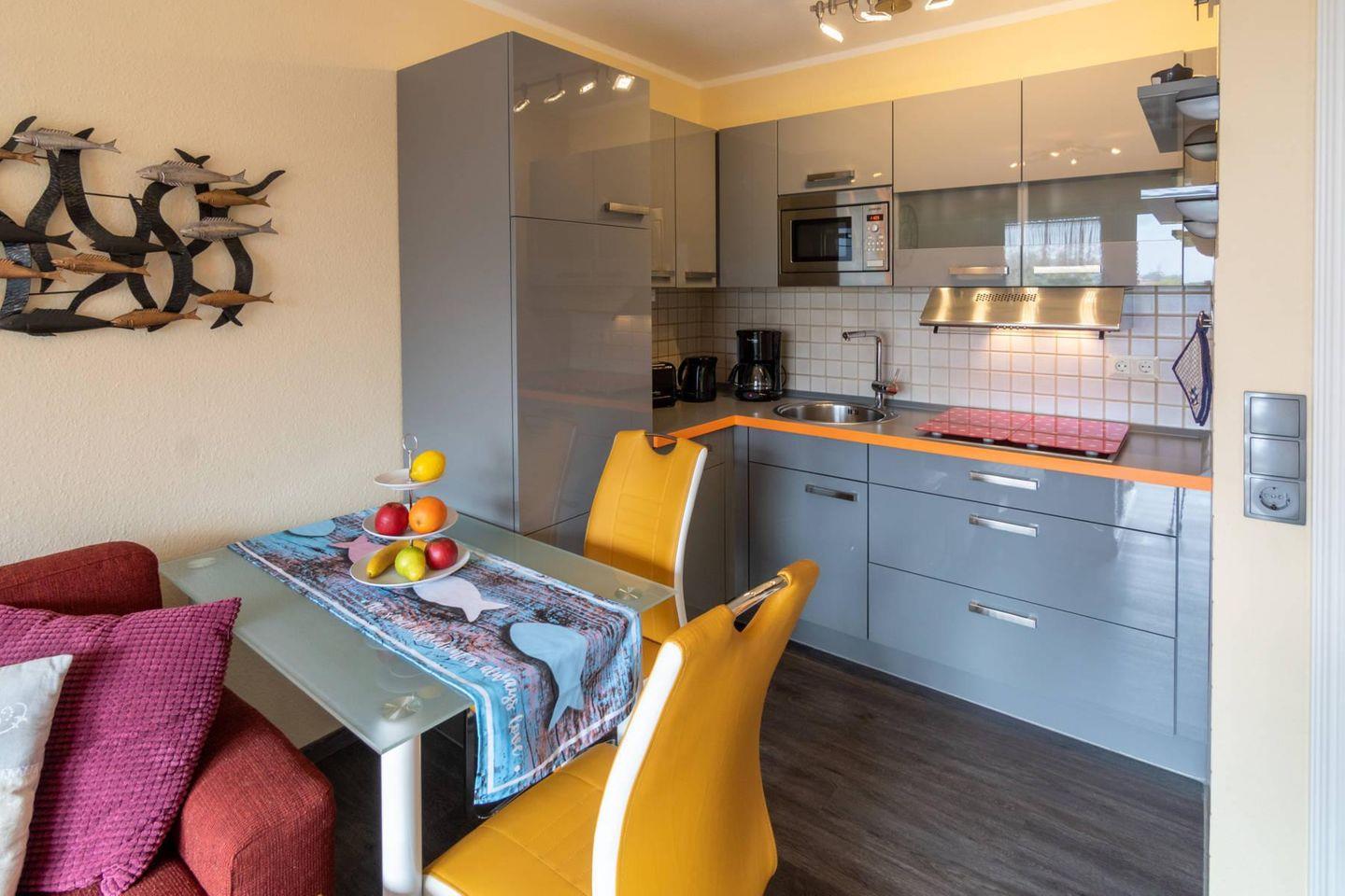 Die charmante Oberwohnung "Utkiek" bietet Ihnen ein gemütliches Zuhause auf Zeit. Der helle Wohn- und Essbereich mit einer voll ausgestatteten Küche, inklusive einem Mini-Backofen, lädt zum Verweilen und Kochen ein. Das Schlafzimmer verfügt über zwei komfortable Einzelbetten (90x200cm), perfekt für eine erholsame Nacht. Das Duschbad mit WC sorgt für Frische und Komfort, während der Abstellraum Platz für Ihre persönlichen Dinge bietet. Genießen Sie vom großzügigen Balkon aus den herrlichen Blick auf den idyllischen Dornumersieler Kanal – der perfekte Ort, um die Seele baumeln zu lassen und die Aussicht zu genießen.