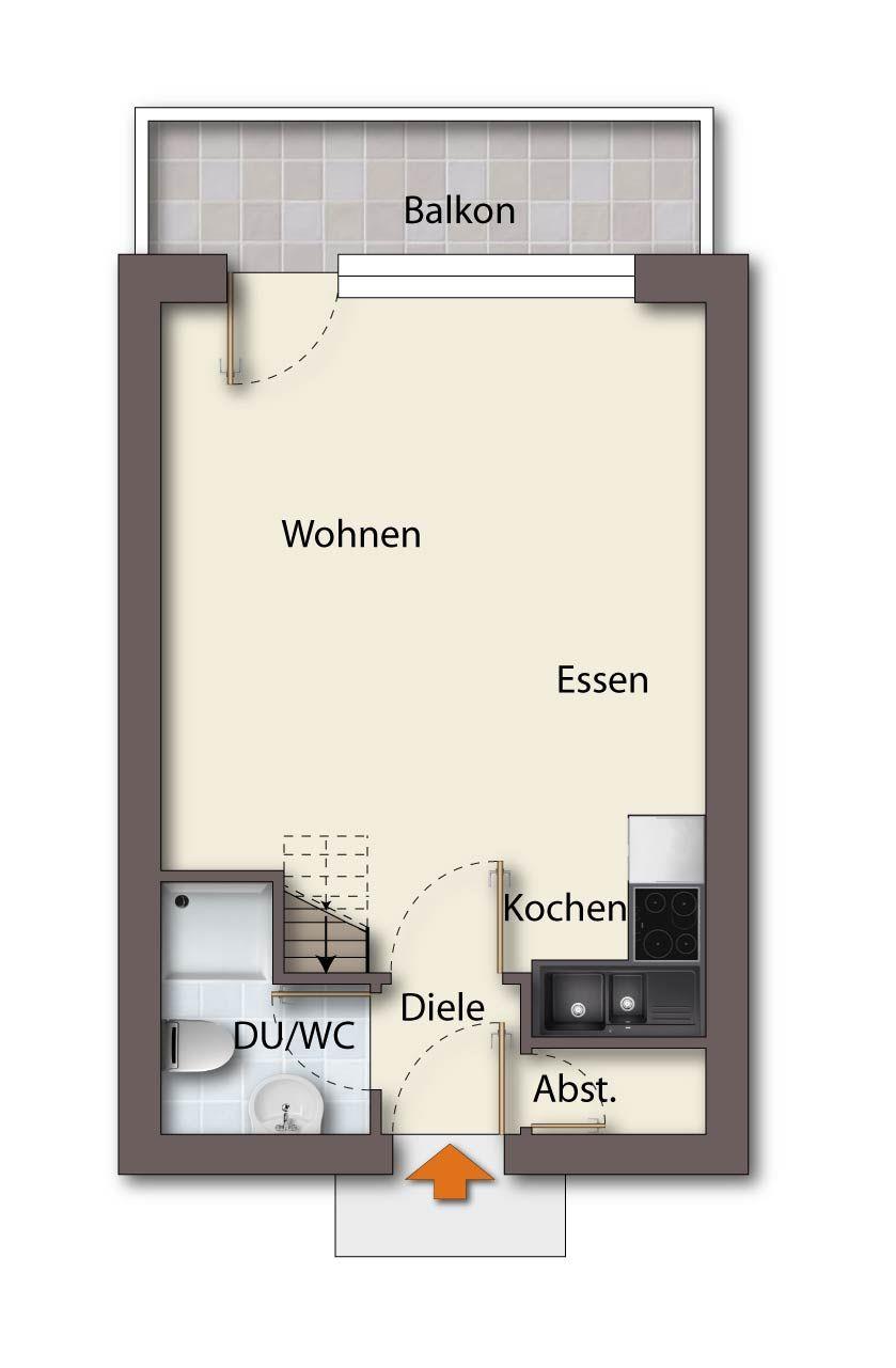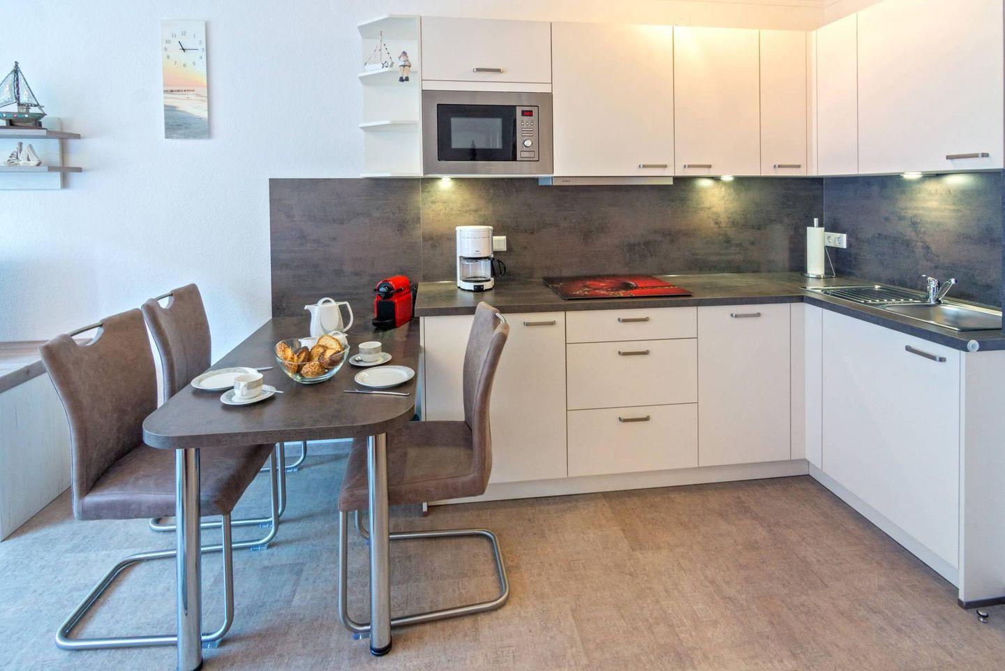 Die charmante Oberwohnung besticht durch ihren modernen Wohn- und Essbereich mit stilvoll eingerichteter, voll ausgestatteter Küche, in der Sie entspannt kochen und gemeinsam genießen können. Das gemütliche Schlafzimmer im ausgebauten Dachgeschoss erreichen Sie über eine platzsparende Raumspartreppe. Das moderne Duschbad mit WC sorgt für zusätzlichen Komfort.