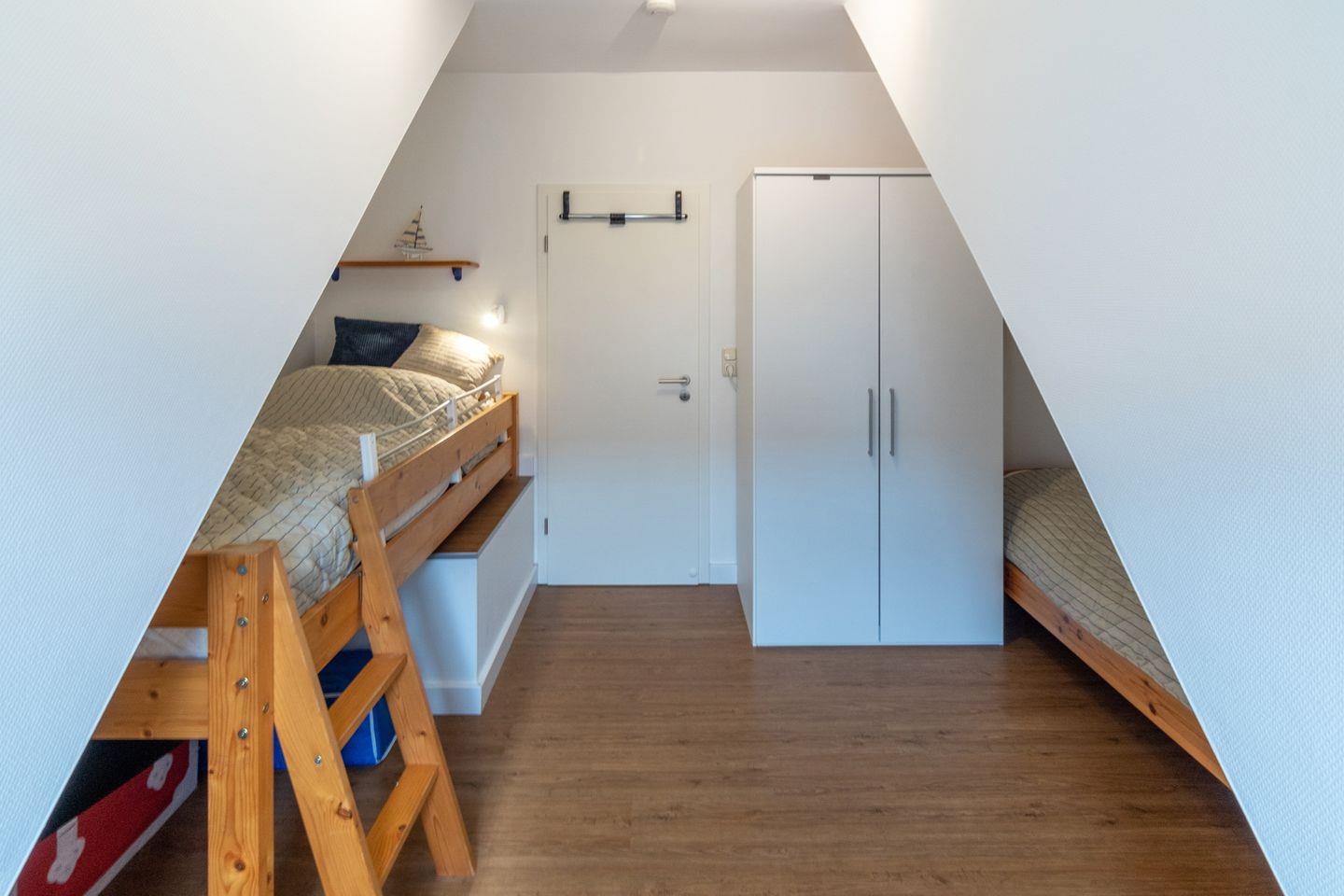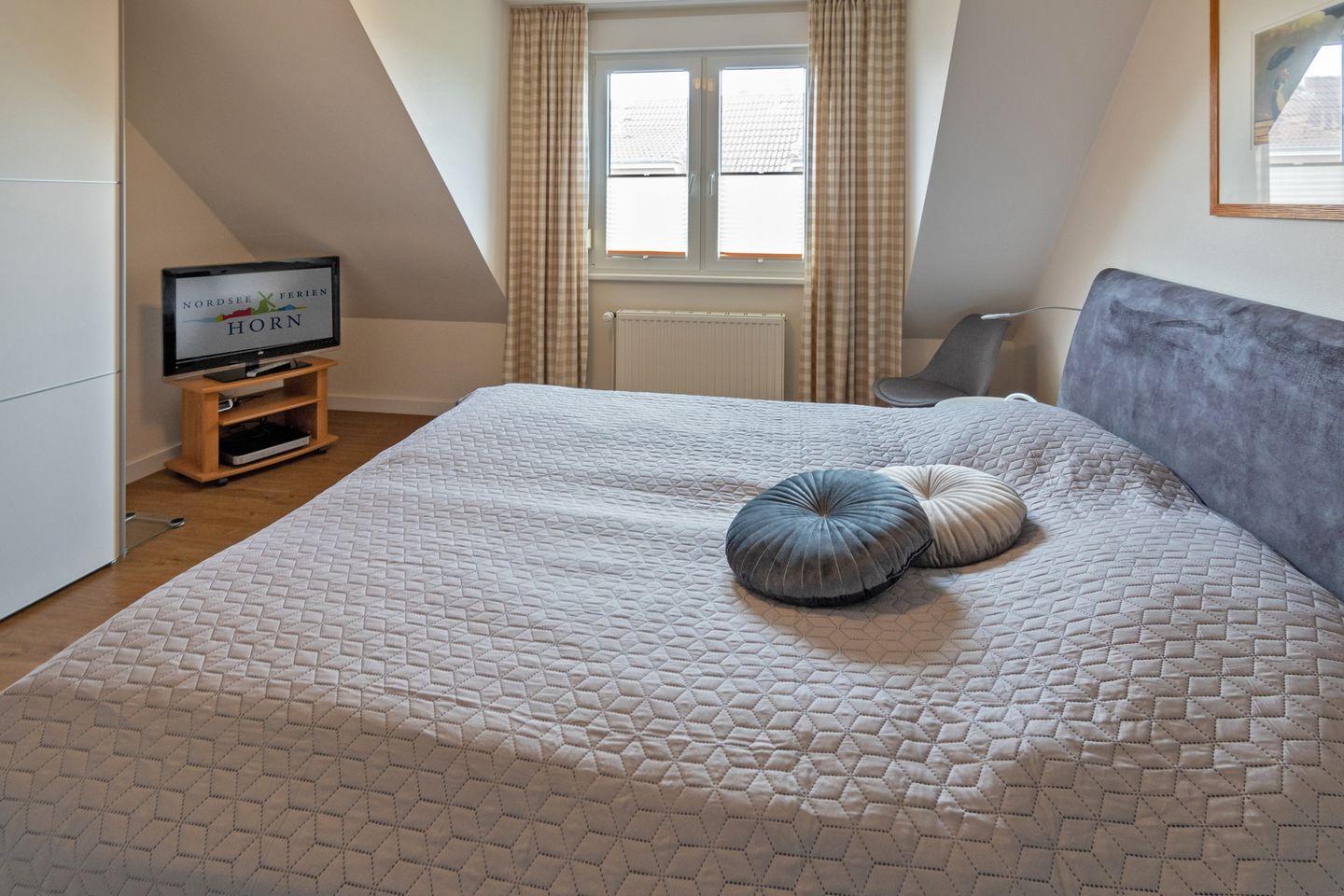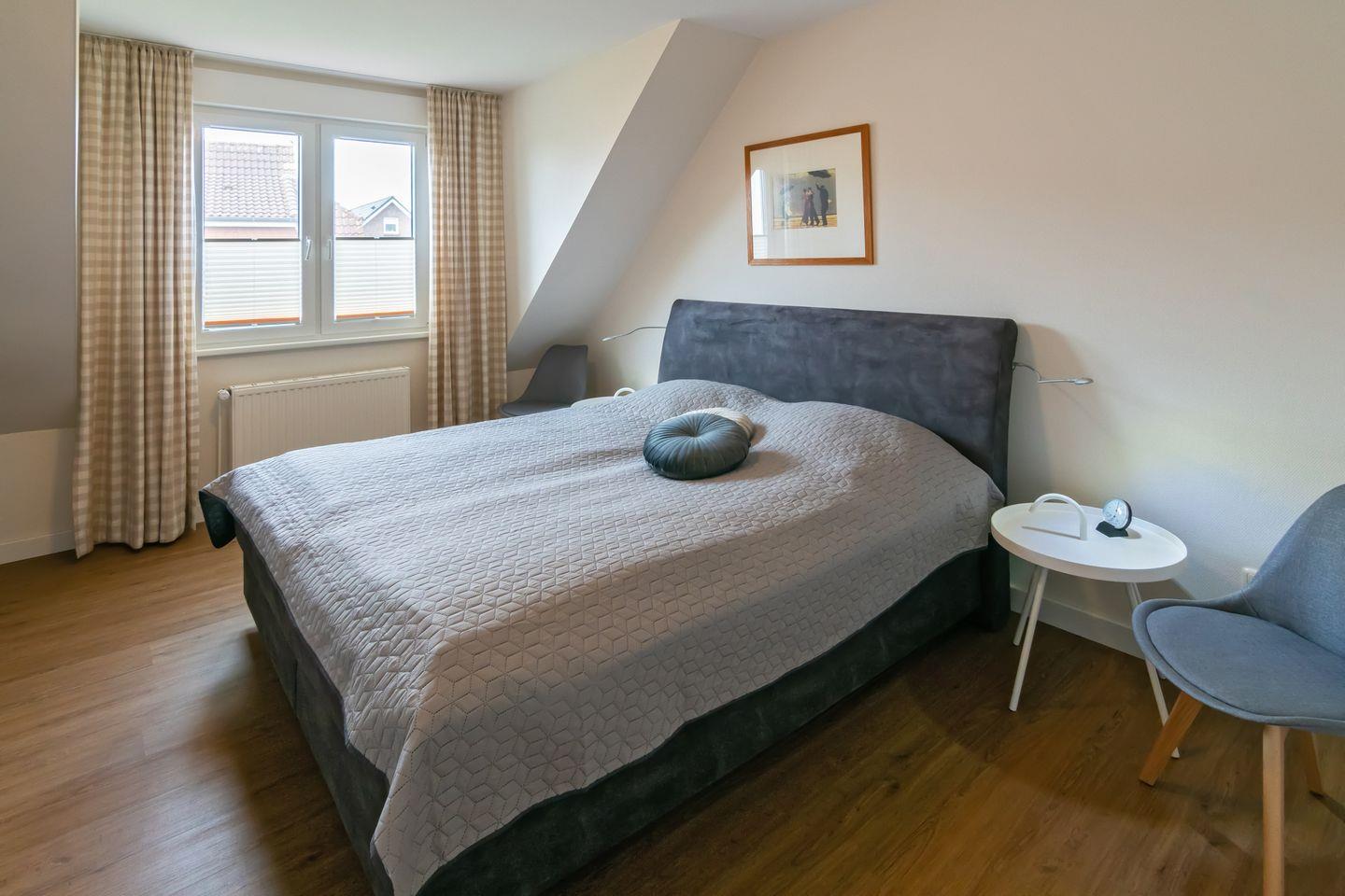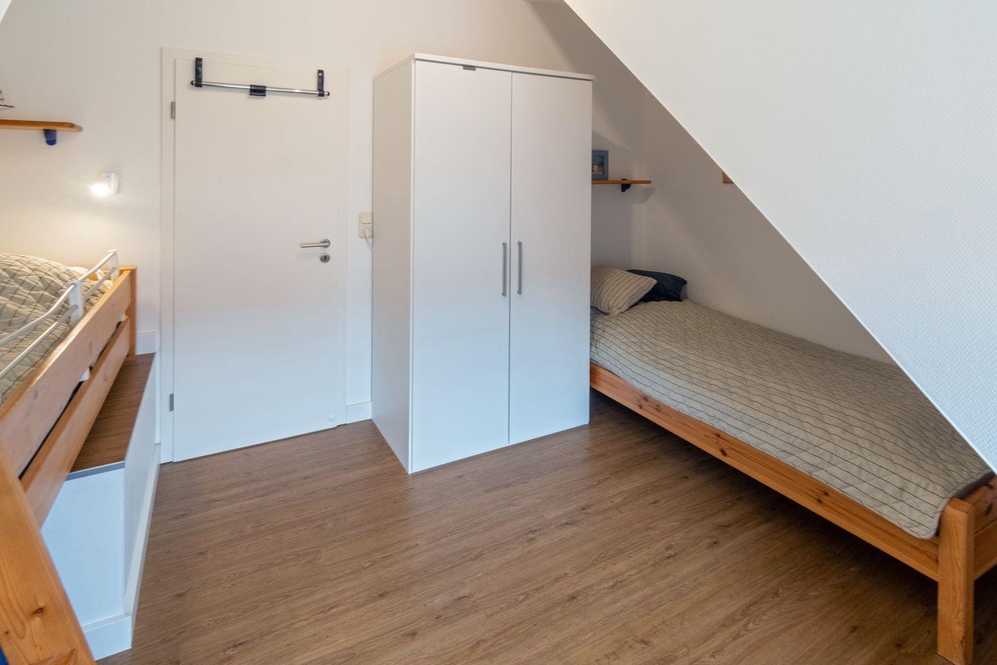 Im Obergeschoss finden Sie zwei gemütliche Schlafzimmer: eines mit einem komfortablen Boxspringbett, das andere mit einem Einzelbett und einem Hochbett, ideal für Kinder. Das moderne Duschbad mit WC rundet das Raumangebot ab und sorgt für erfrischende Momente nach einem Tag am Strand oder in der Umgebung.