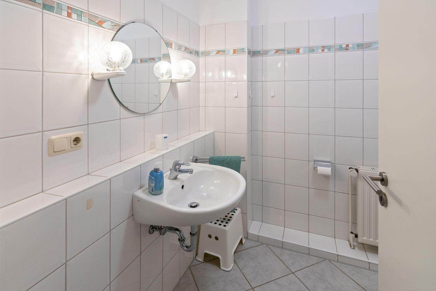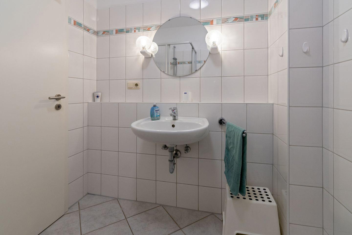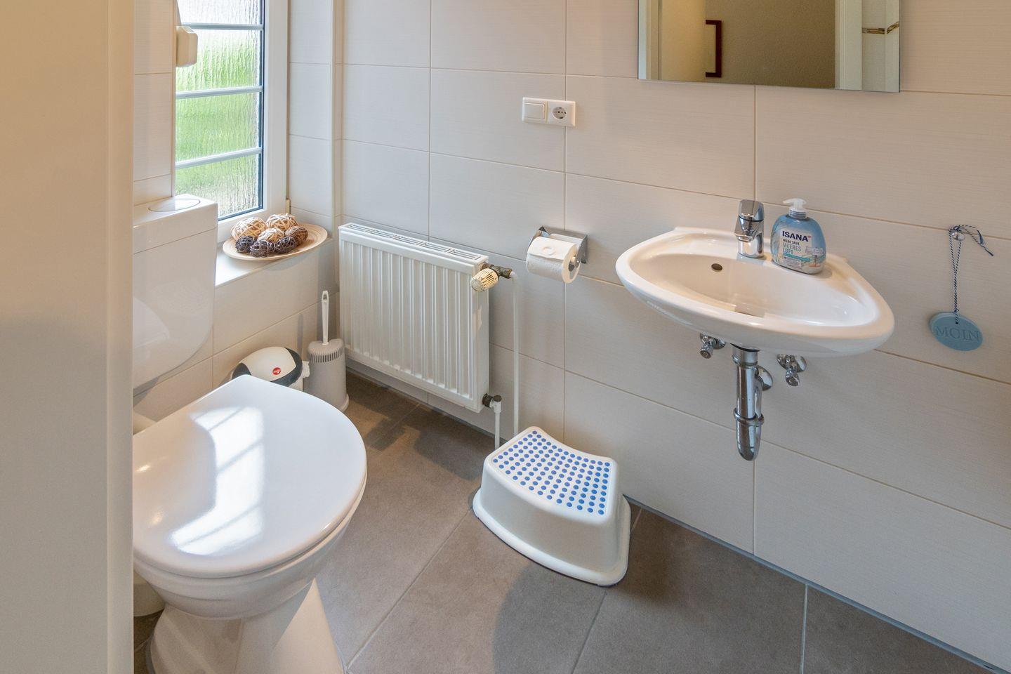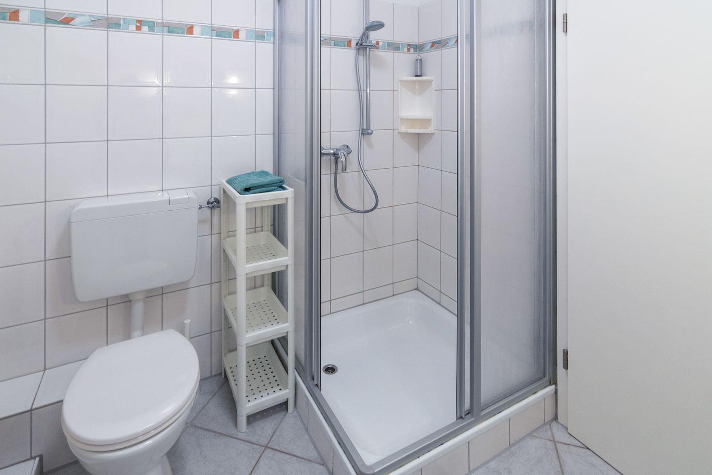 Im Obergeschoss finden Sie zwei gemütliche Schlafzimmer: eines mit einem komfortablen Boxspringbett, das andere mit einem Einzelbett und einem Hochbett, ideal für Kinder. Das moderne Duschbad mit WC rundet das Raumangebot ab und sorgt für erfrischende Momente nach einem Tag am Strand oder in der Umgebung.