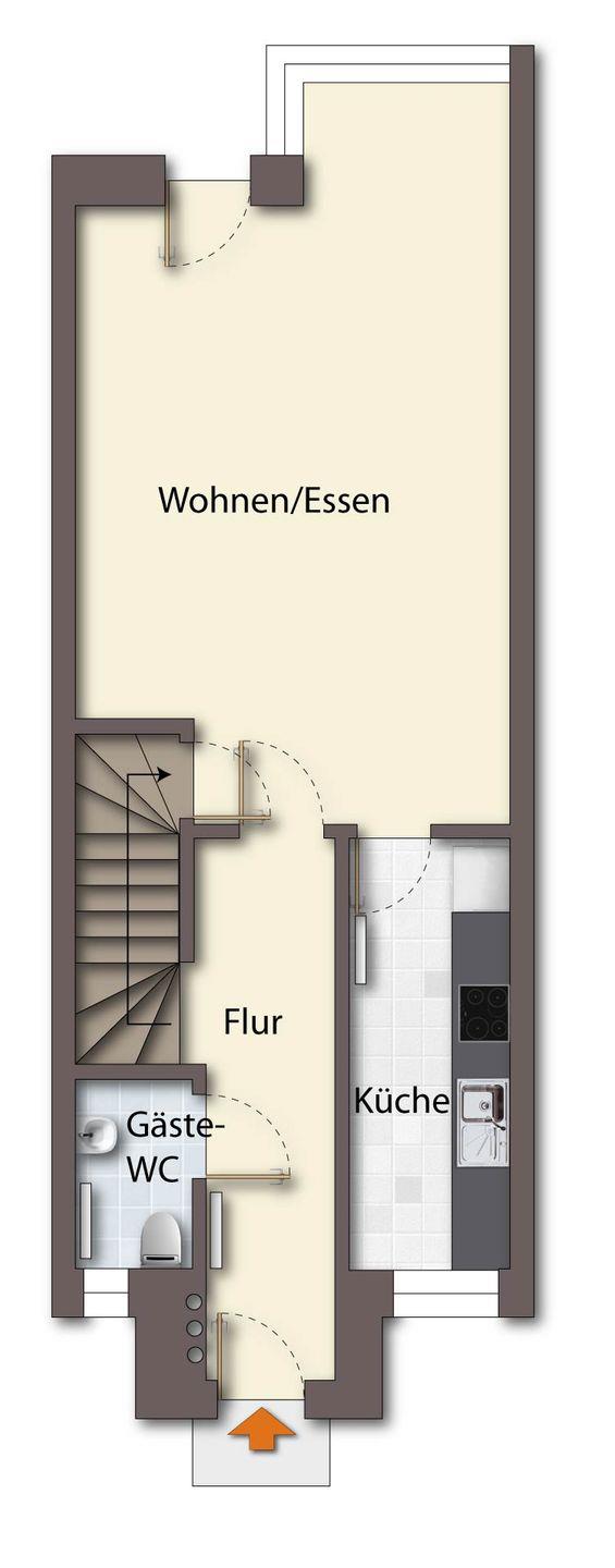 Im Erdgeschoss erwartet Sie ein großzügiger Wohn- und Essbereich, der zum Entspannen und gemeinsamen Zeit verbringen einlädt. Die separate, voll ausgestattete Küche verfügt über alle Annehmlichkeiten für die Zubereitung leckerer Mahlzeiten, inklusive einer Waschmaschine. Ein Gäste-WC sorgt für zusätzlichen Komfort.