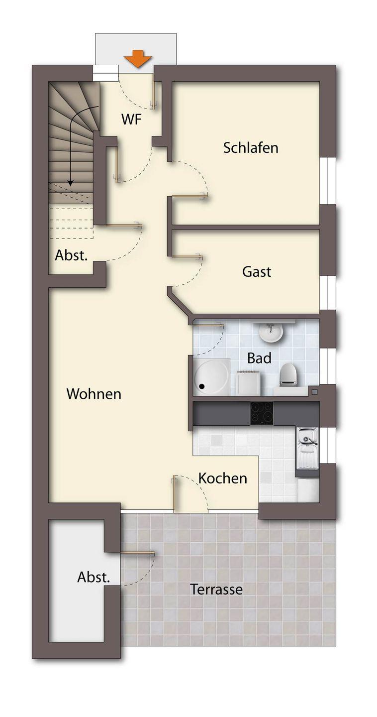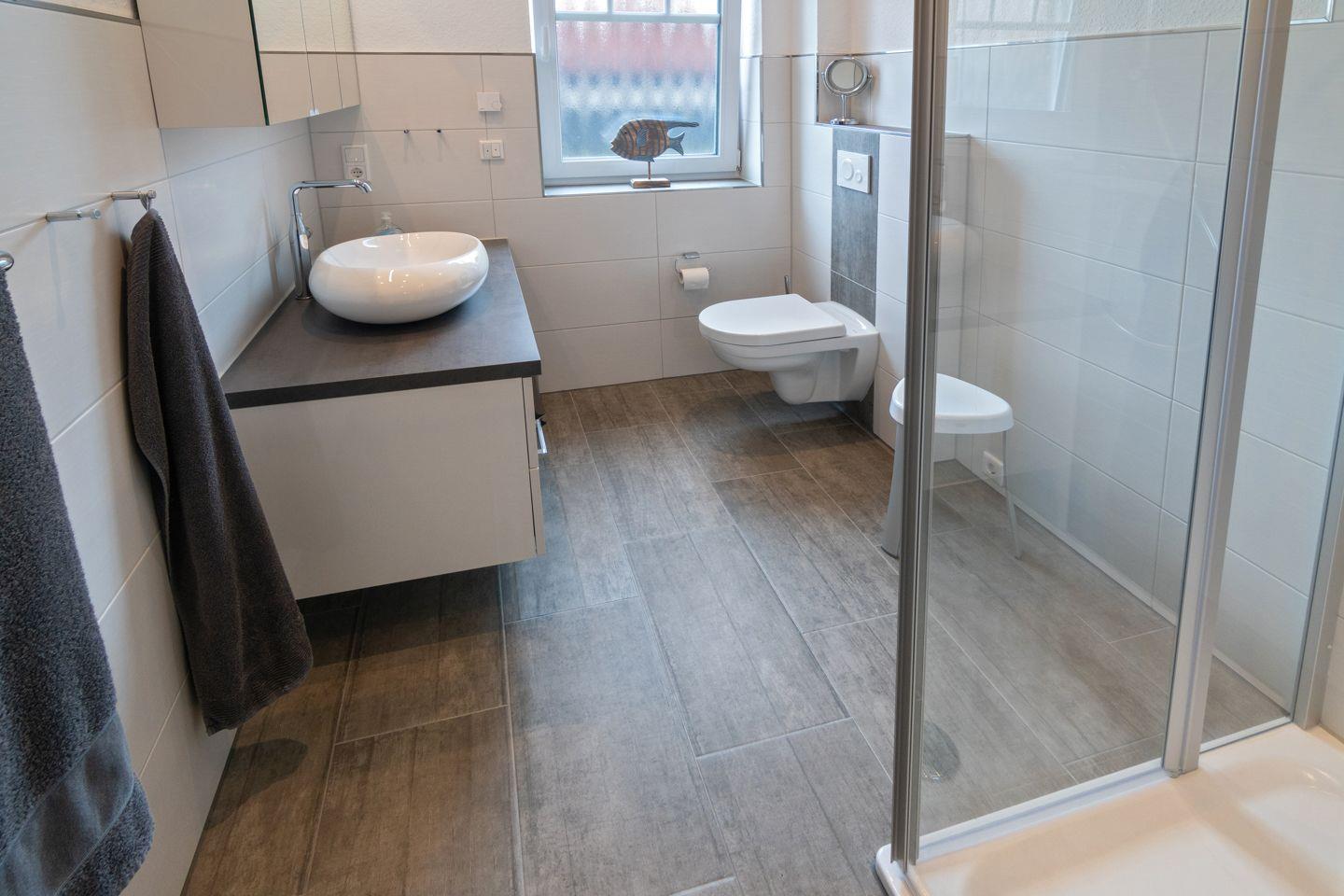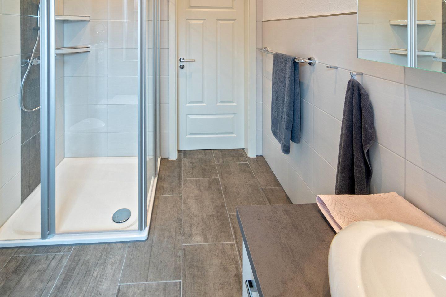 Das helle Duschbad verfügt über eine bodengleiche Dusche. Eine eigene Waschmaschine steht ebenfalls bereit. Fahrräder können im Abstellraum untergebracht werden, ein PKW-Stellplatz ist direkt vor der Tür.