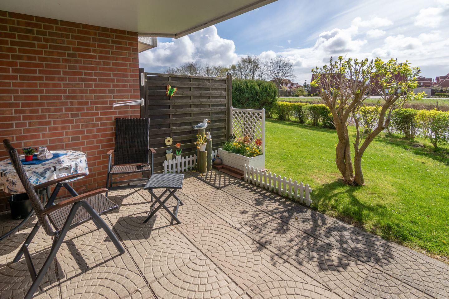 Ein absolutes Highlight ist die private, ruhige Terrasse mit Blick auf einen idyllischen Kanal. Hier können Sie die frische Nordseeluft genießen, den Tag bei einem Frühstück im Freien beginnen oder entspannt in den Abendstunden ausklingen lassen. Bequeme Gartenmöbel laden dazu ein, die Natur in vollen Zügen zu genießen.