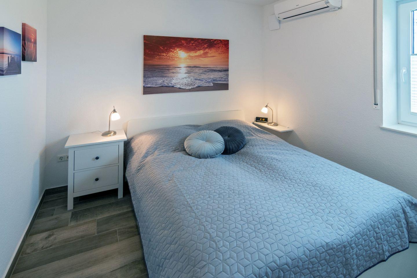 Der lichtdurchflutete Wohn- und Essbereich lädt zum Verweilen ein und bietet direkten Zugang zur angrenzenden, voll ausgestatteten Küche. Hier finden Sie alles, was Sie für die Zubereitung Ihrer Mahlzeiten benötigen. Das Elternschlafzimmer ist mit einem 1,60 m breiten Bett ausgestattet sowie mit einer Klimaanlage, die Ihnen an heißen Sommertagen angenehme Kühle verschafft. Ein weiteres Schlafzimmer, ebenfalls mit einem 1,60 m Bett, bietet zusätzlichen Platz für die Familie. Das maritime Duschbad mit WC unterstreicht das Urlaubsgefühl und sorgt für den nötigen Komfort.
