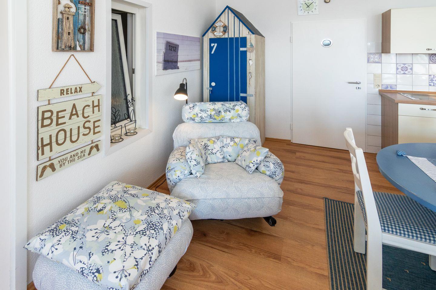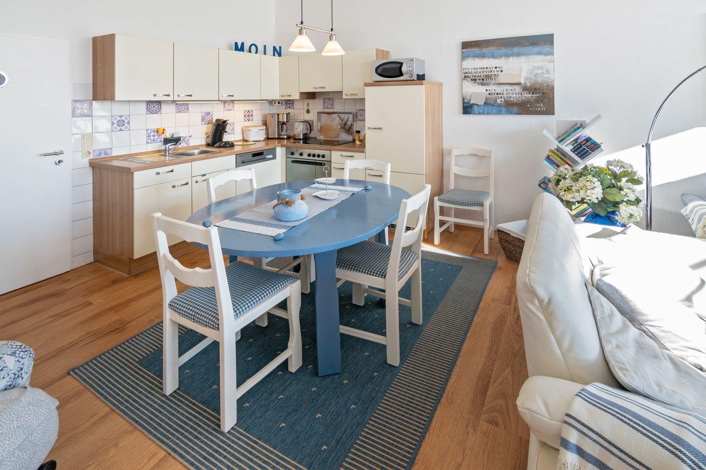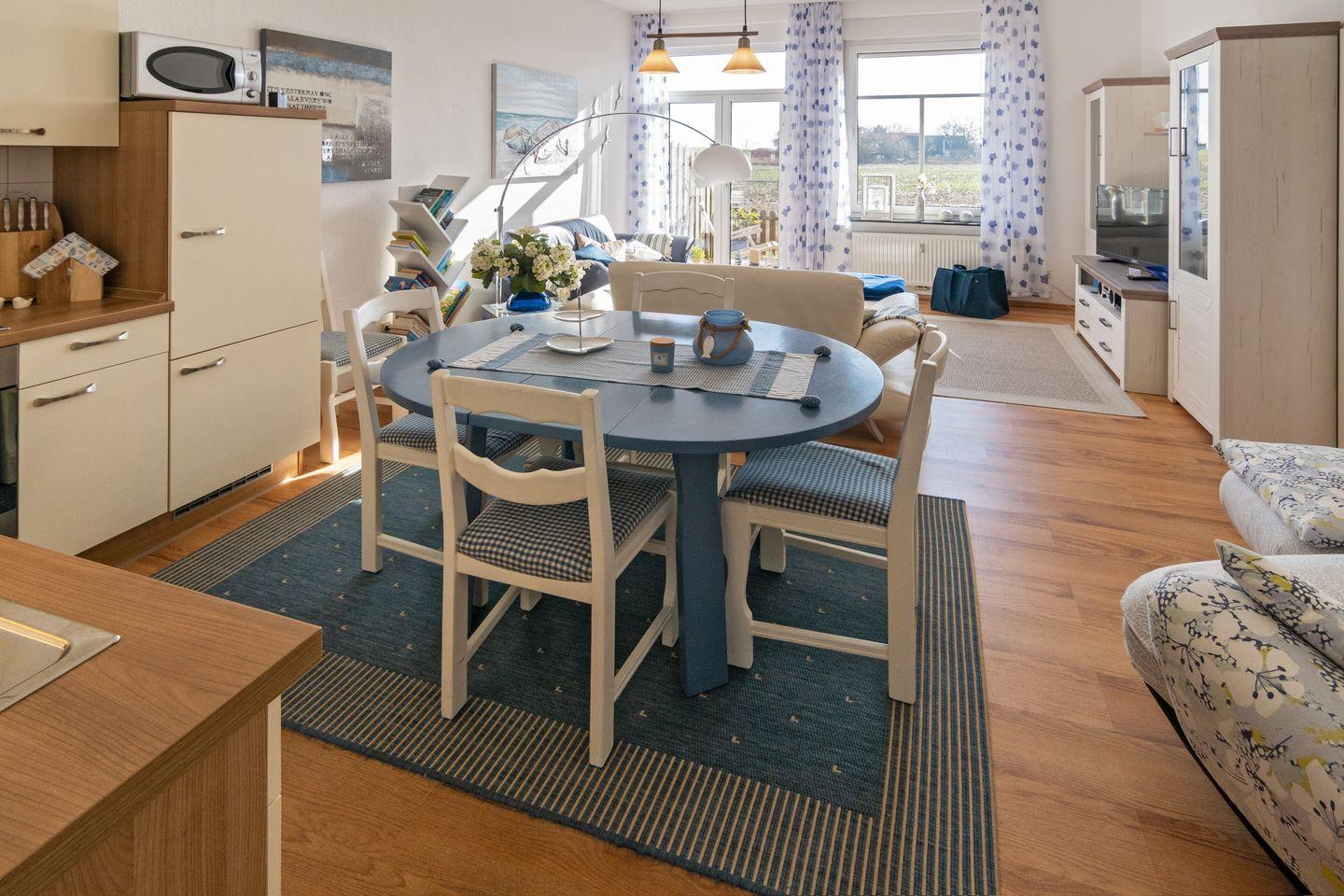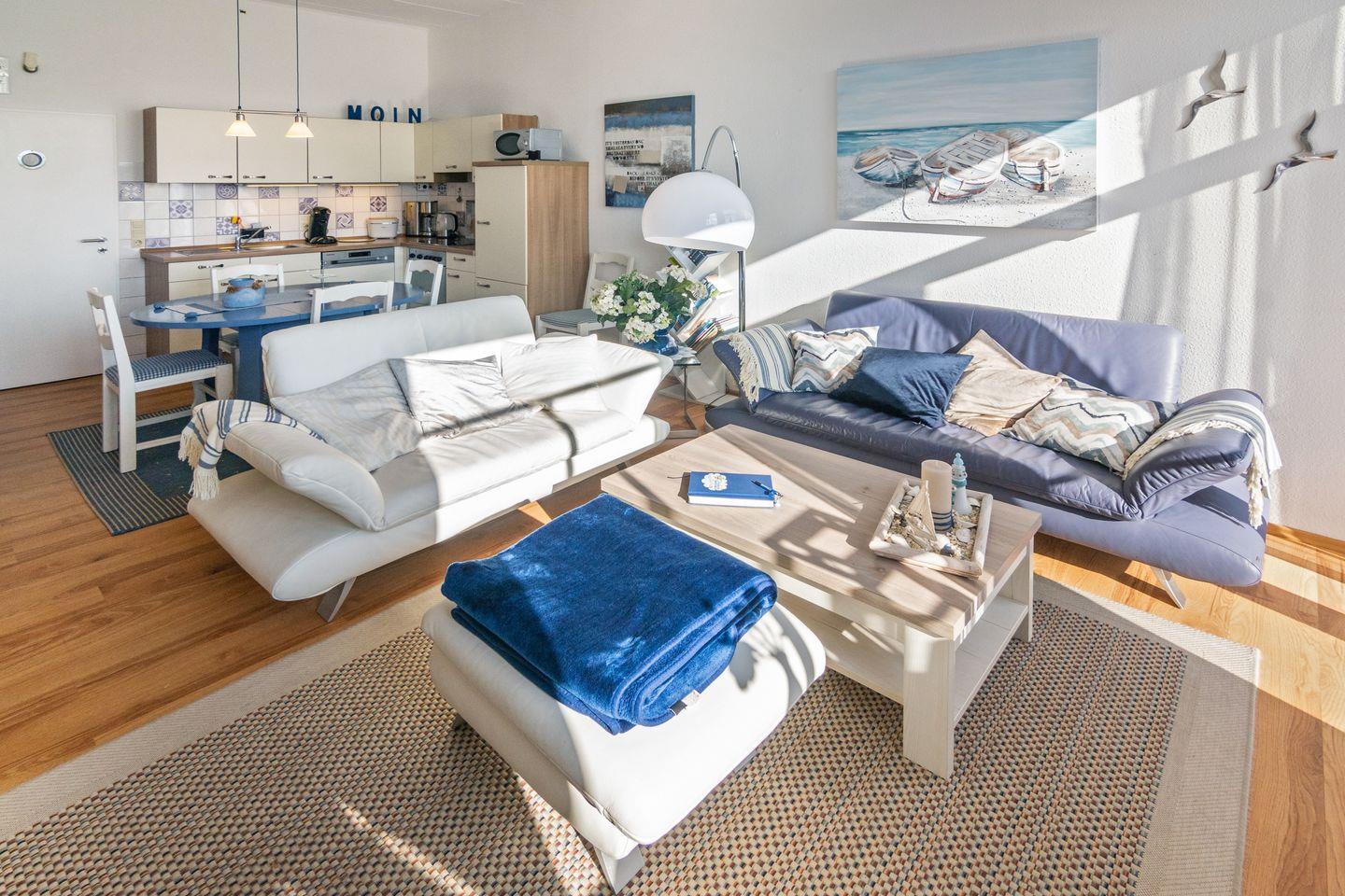 Auf 67 m² erwartet Sie eine großzügige Raumaufteilung mit zwei gemütlichen Schlafzimmern, die Platz für bis zu vier Personen bieten (jeweils mit Doppelbett, eines davon ohne Außenfenster, dafür mit Fenster zum anderen Schlafzimmer). Der offene Wohnbereich, ausgestattet mit einer modernen Küche und einem einladenden Essbereich, lässt keine Wünsche offen. Genießen Sie gemeinsame Mahlzeiten am Esstisch oder entspannen Sie im Wohnzimmer, das mit einem komfortablen Sofa sowie einem Fernseher, einem DVD-Spieler und einer HiFi-Anlage ausgestattet ist. Für Ihre Unterhaltung stehen auch eine Auswahl an Büchern, CDs und Spielen zur Verfügung.
