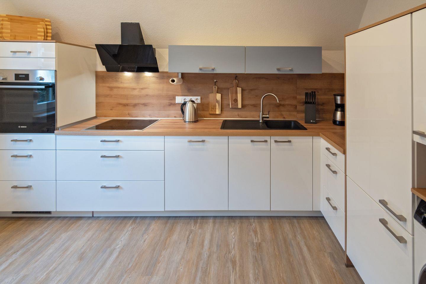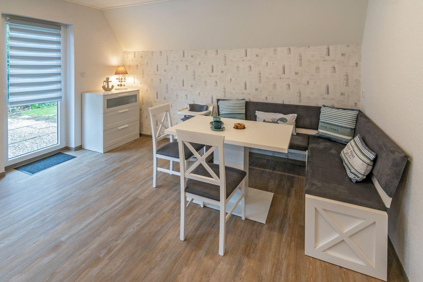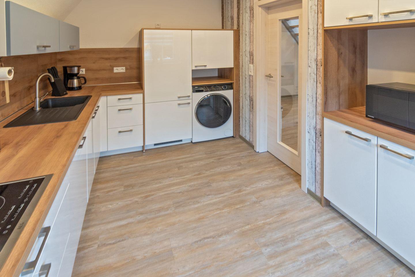 Die Küche ist als abgeschlossener Raum konzipiert und mit hochwertigen Geräten umfassend ausgestattet: Gäste profitieren von einem Ceran-Herd, Backofen, Mikrowelle, Kühlschrank mit Gefrierfach, Spülmaschine, Kaffeemaschine, Toaster, Wasserkocher, Eierkocher, Mixer sowie sämtlichen Küchenutensilien, Geschirr und Besteck für einen entspannten Selbstversorger-Urlaub. Im separaten Essbereich können gemeinsame Mahlzeiten in ruhigem Ambiente eingenommen werden.