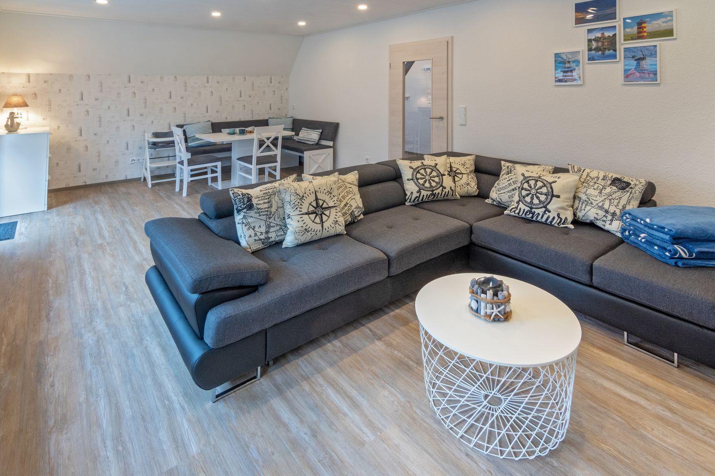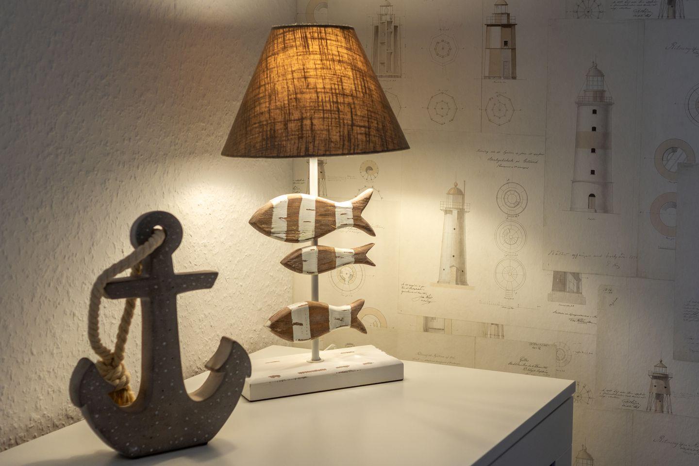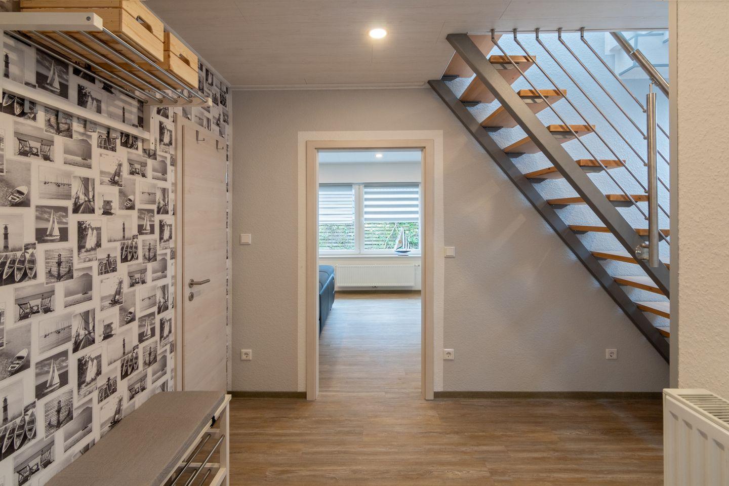 Das Badezimmer ist hell und modern gestaltet, verfügt über eine bodengleiche Dusche, Waschbecken, WC und ein Fenster. Zusätzlich ist ein Gäste-WC vorhanden, was besonders bei voller Belegung zusätzlichen Komfort bietet. Für die Jüngsten stehen ein Treppengitter, ein Kinderhochstuhl sowie ein Babybett zur Verfügung. Zudem gibt es zwei Zustellbetten, sodass sich die Unterkunft flexibel den Bedürfnissen kleiner Familien anpasst. Kinder sind im Muschelsammler ausdrücklich willkommen.