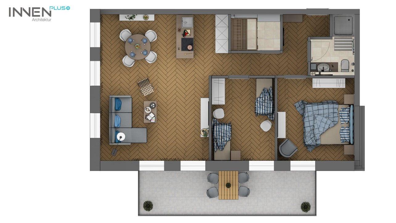 Der lichtdurchflutete Wohn- und Essbereich lädt zum Entspannen und Wohlfühlen ein. Hier können Sie den Tag in Ruhe ausklingen lassen, während Sie sich in der angrenzenden, voll ausgestatteten Küche kulinarisch verwöhnen. Diese bietet alles, was Sie für die Zubereitung Ihrer Lieblingsgerichte benötigen. Die beiden Schlafzimmer sind geschmackvoll eingerichtet – eines mit einem gemütlichen Ehebett, das andere mit zwei komfortablen Einzelbetten.