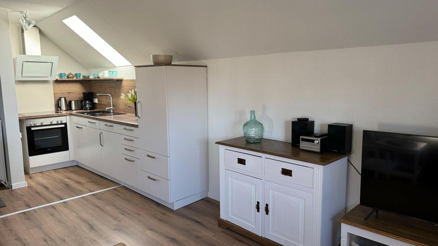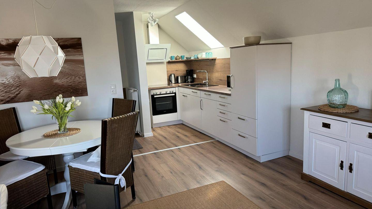 Die Ferienwohnung "Utkiek" für 2 Personen liegt in der 1. Etage des historischen Gebäudeteils. Nach der schönen Aussicht müssen sie nicht lange suchen, sie haben einen wunderschönen Blick auf das Dornumersieler Tief. Die Wohnung ist gerade frisch renoviert und hat eine neue großzügige, offene Küche und ein Wohnzimmer mit Essbereich, ein SmartTV, ein Schlafzimmer mit Doppelbett (1,80 m) und ein neues Duschbad. Es steht eine separate Waschküche mit Waschmaschine, Trockner, Bügeleisen und Bügelbrett gegen Gebühr zur Verfügung. Ein Aussensitzplatz sowie kostenloses WLAN sind ebenfalls vorhanden. Ein Hund darf gerne mitreisen.
