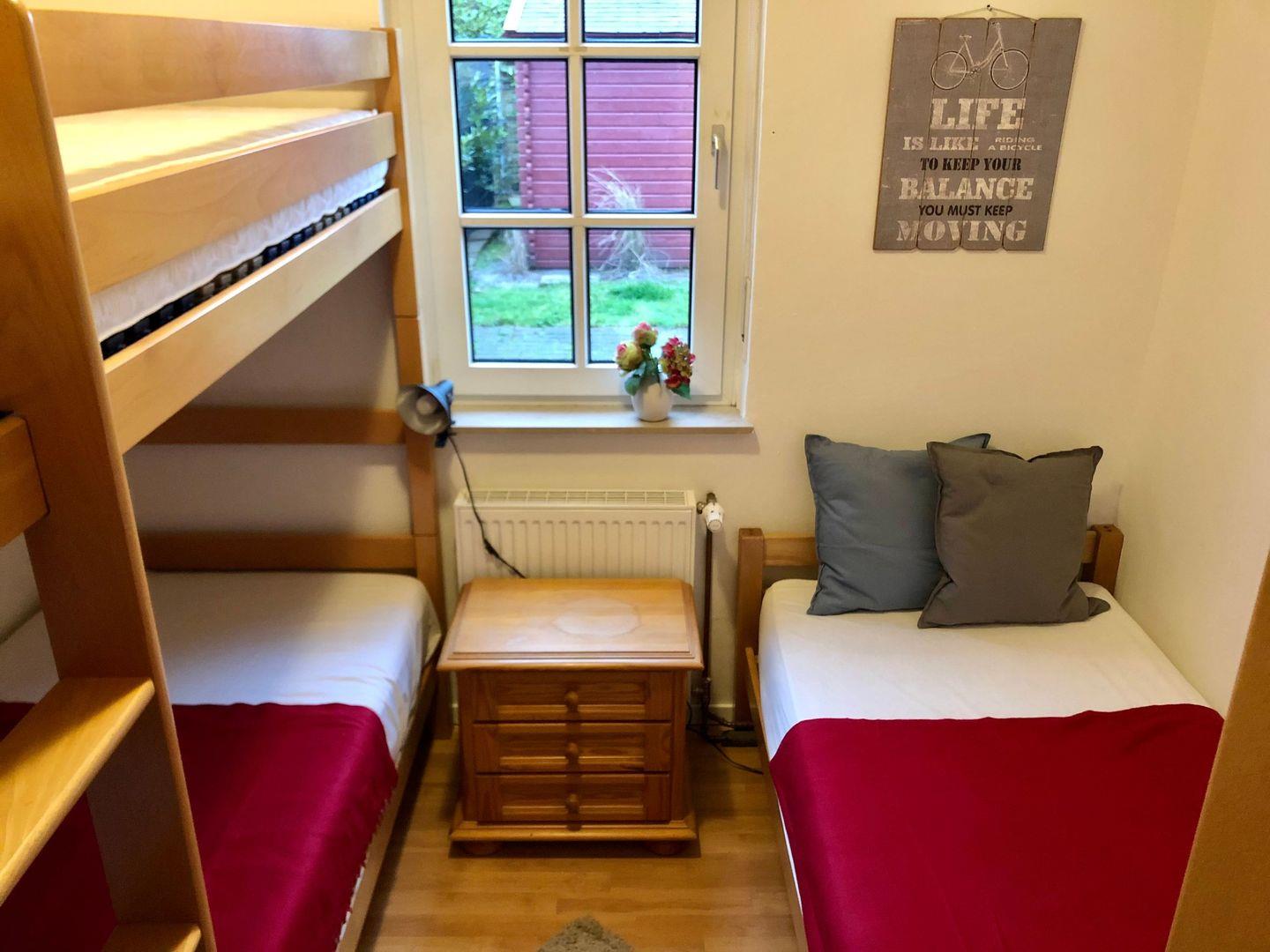 2 gemütliche Schlafzimmer: Ein Schlafzimmer mit komfortablem Doppelbett und ein weiteres mit einem Etagenbett sowie einem zusätzlichen Einzelbett.