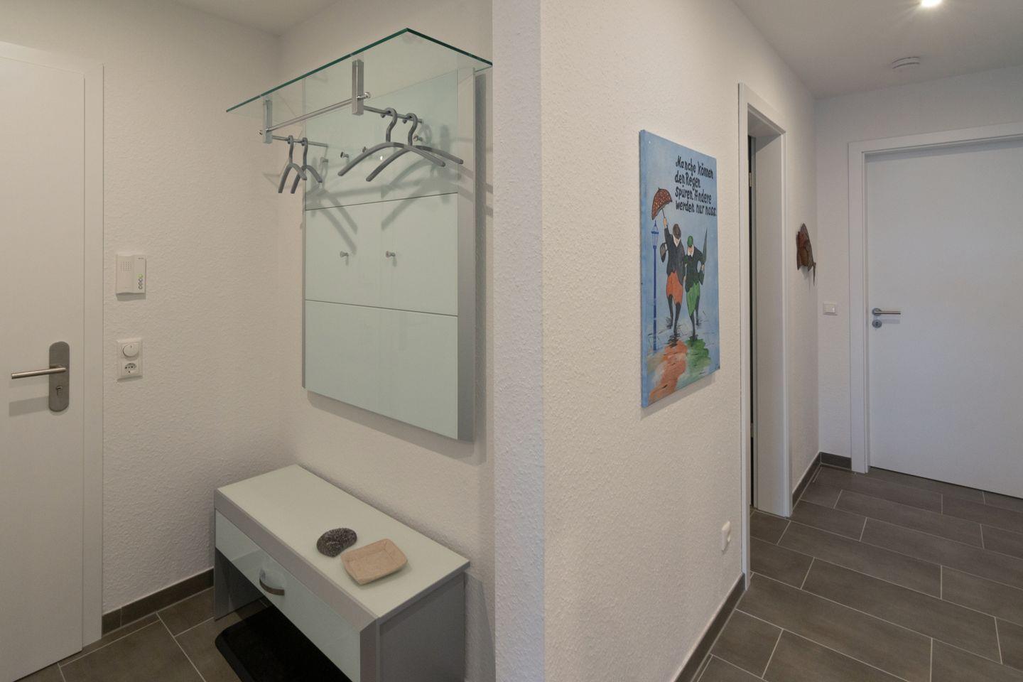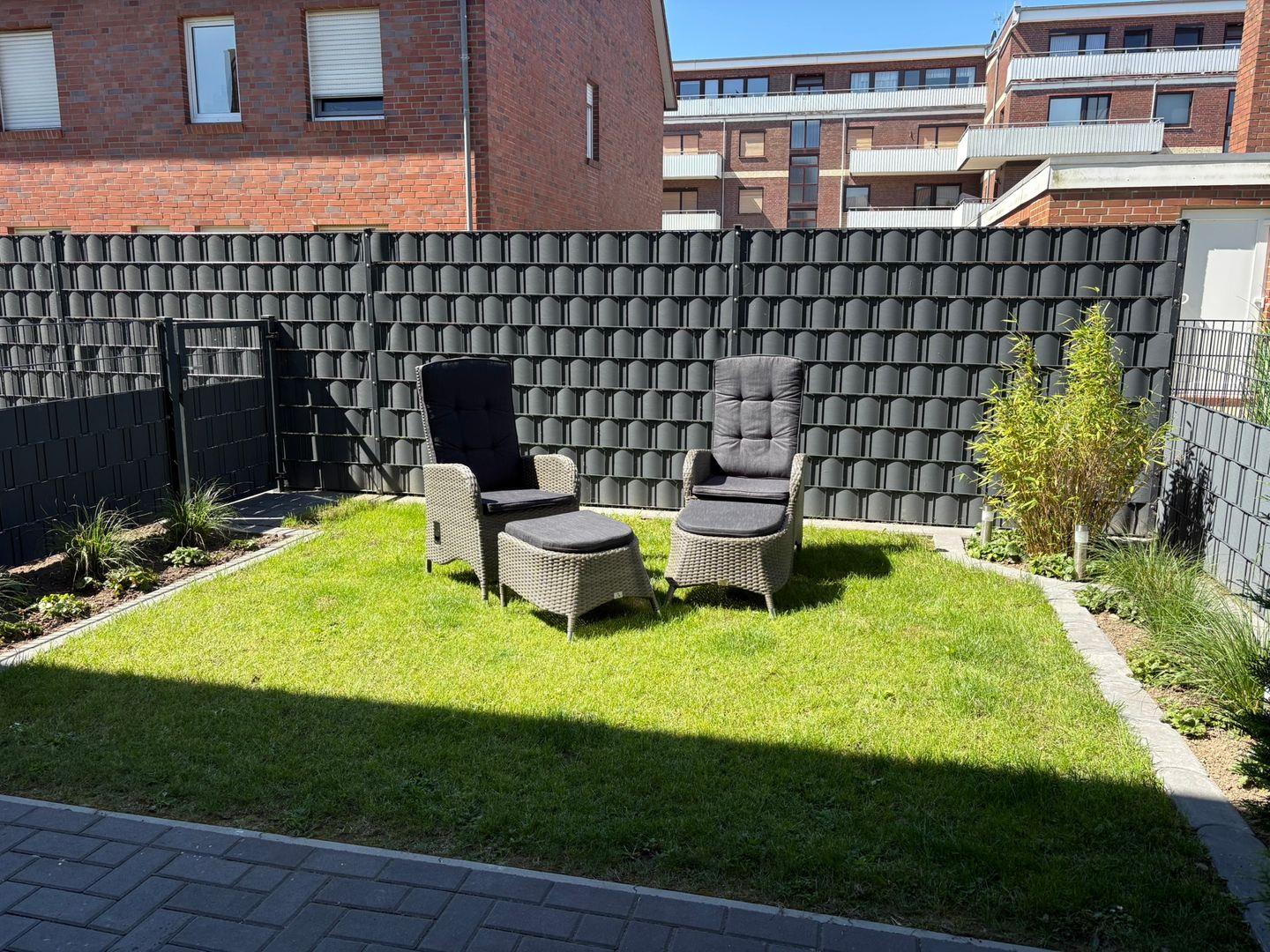 Die Wohnung verfügt über eine weitläufige Südterrasse, die mit einem gemütlichen Strandkorb und stilvollen Gartenmöbeln zum Verweilen einlädt. Der angrenzende Garten bietet weitere Möglichkeiten, die frische Meeresluft in vollen Zügen zu genießen. Ein großer Smart-TV im Wohnzimmer sorgt für beste Unterhaltung, während die Fußbodenheizung in der gesamten Wohnung für behagliche Wärme sorgt. Ein schneller Internetzugang über Gigacube rundet das moderne Wohnambiente ab.