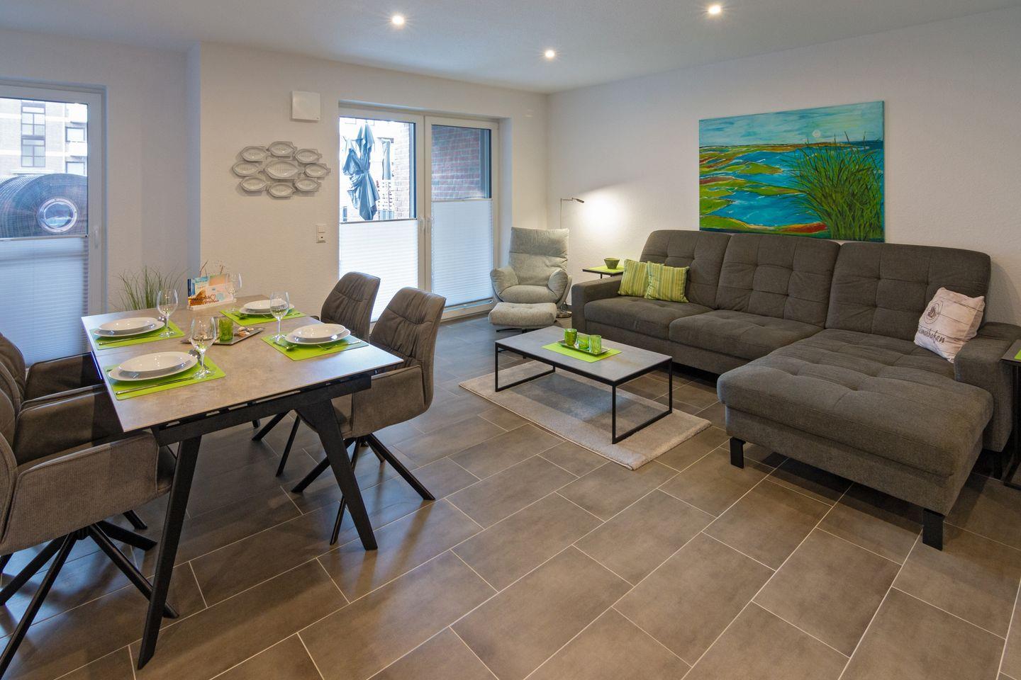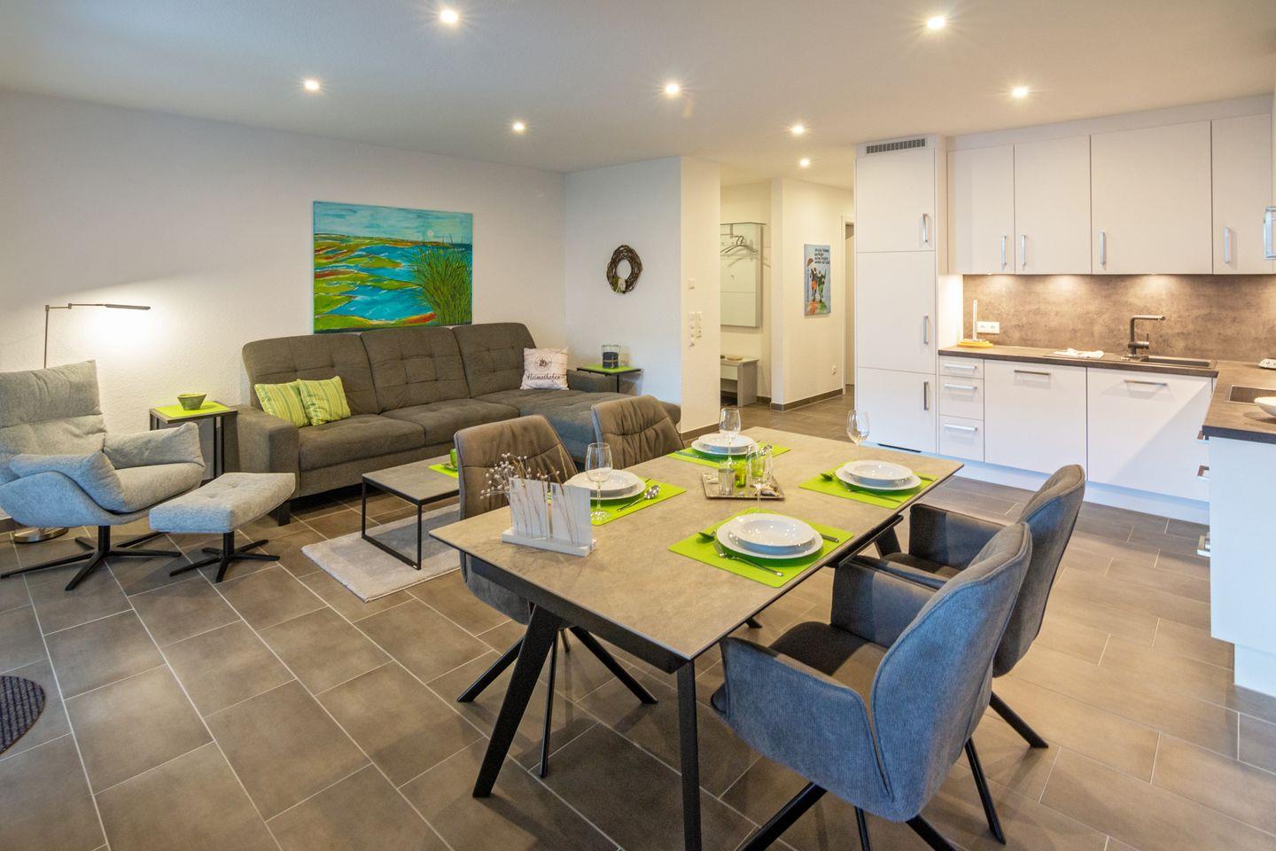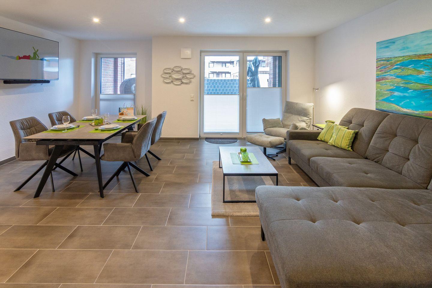 Moderne Ferienwohnung in Dornumersiel mit Terrasse, Garten, Smart-TV und E-Auto-Ladestation für erholsamen Urlaub an der Nordseeküste.