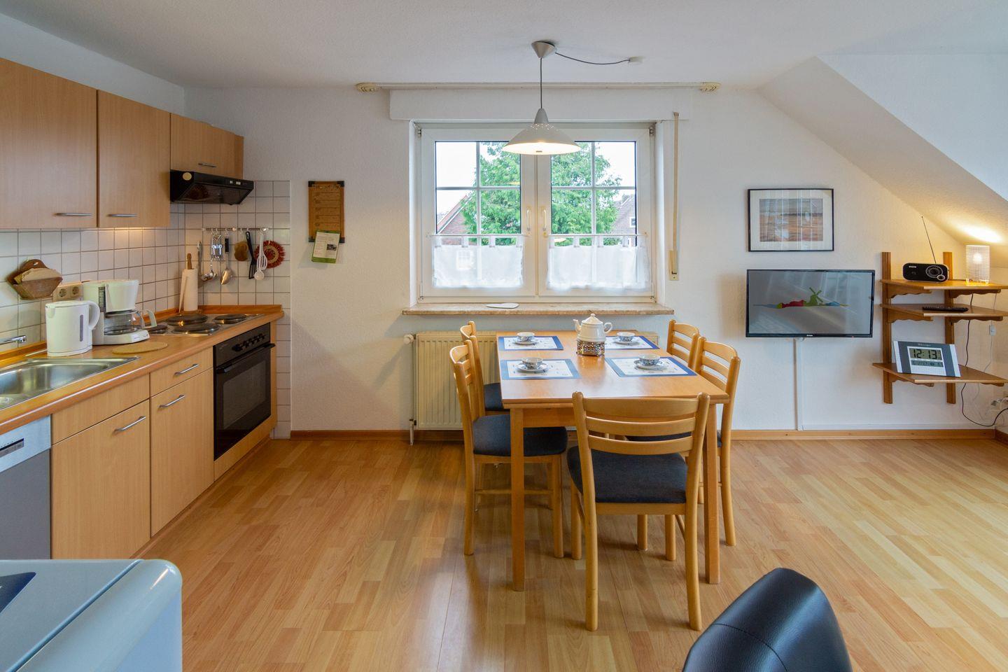 Die Ferienwohnung bietet auf 60 m² Platz für bis zu 4 Personen. Der Wohn- und Essbereich mit voll ausgestatteter Küche lädt zum Wohlfühlen ein. Es gibt ein Duschbad mit WC, ein Schlafzimmer mit Ehebett im Obergeschoss und ein weiteres Schlafzimmer mit zwei Einzelbetten im Dachgeschoss, das über eine Raumspartreppe erreichbar ist. Ein Balkon mit Gartenmöbeln, ein PKW-Stellplatz, ein Abstellraum für Fahrräder und WLAN gehören ebenfalls zur Ausstattung. Ein Hund ist herzlich willkommen.