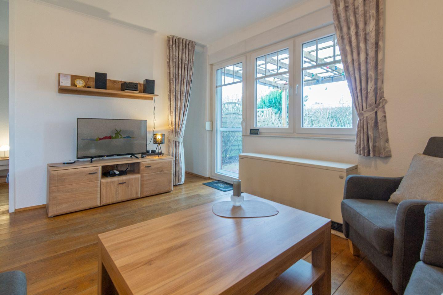 Ein Highlight ist die große, möblierte Terrasse mit Strandkorb und Zugang zum eingezäunten Garten – ideal zum Sonnen, Spielen und Entspannen an der frischen Luft.