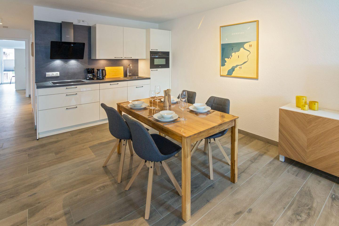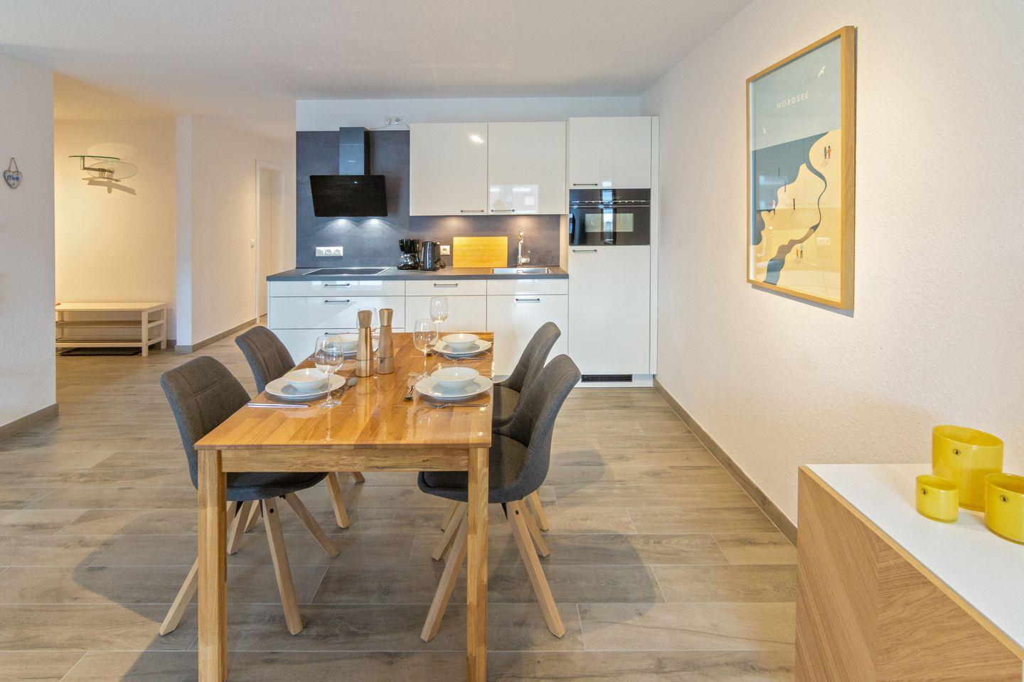 Willkommen in der Ferienwohnung "Küstenkrabbe" – dem idealen Rückzugsort für Familien, Paare und aktive Gäste an der Nordsee! Die moderne Wohnung aus dem Jahr 2023 bietet auf 84 m² Platz für bis zu vier Personen und ein Kleinkind. Zwei geschmackvoll eingerichtete Schlafzimmer, ein großzügiges Wohnzimmer und eine voll ausgestattete, offene Küche schaffen beste Voraussetzungen für entspannte Urlaubstage.