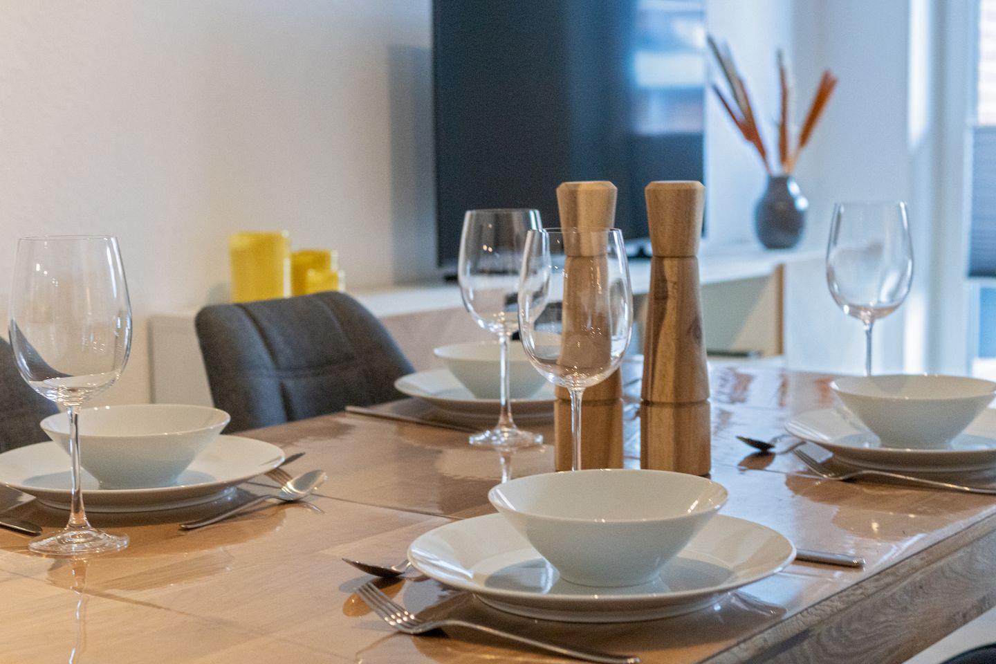 Die lichtdurchflutete Wohnung im ersten Stock überzeugt durch eine freundliche Atmosphäre und Fußbodenheizung. Im Wohnzimmer erwarten Sie ein gemütliches Sofa sowie ein TV mit Satellitenanschluss – ideal für entspannte Abende. Die Küche ist mit Induktionsherd, Backofen, Kühlschrank, Spülmaschine und Kaffeemaschine ausgestattet. Am Esstisch genießen Sie Ihre Mahlzeiten in geselliger Runde.