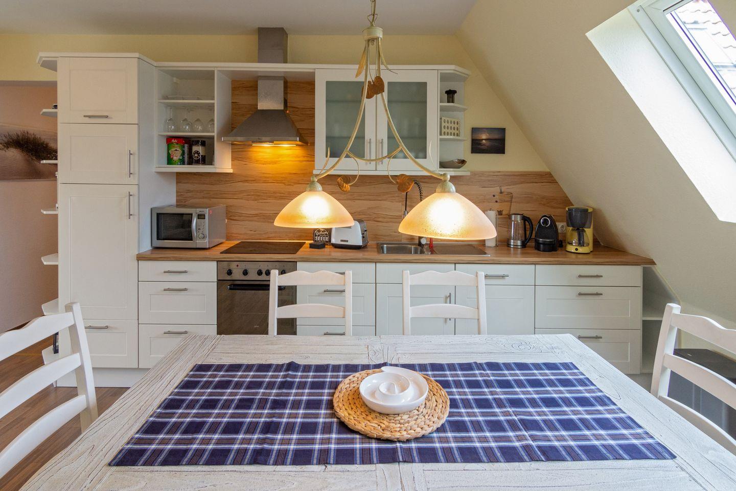 Mit einer Größe von 64 m² bietet das offene Wohnkonzept eine harmonische Verbindung zwischen Küche und Wohnzimmer. Hier können Sie in der voll ausgestatteten Küche mit hochwertigen Geräten, wie einem Cerankochfeld, Backofen, Spülmaschine, Mikrowelle und sogar einer Nespresso-Maschine, kulinarische Köstlichkeiten zaubern. Genießen Sie die Zeit beim gemeinsamen Kochen und Essen am Esstisch oder machen Sie es sich auf dem gemütlichen Sofa bequem, während Sie den Fernseher mit Satellitenanschluss oder Ihre Lieblingsmusik auf dem CD-Player hören.