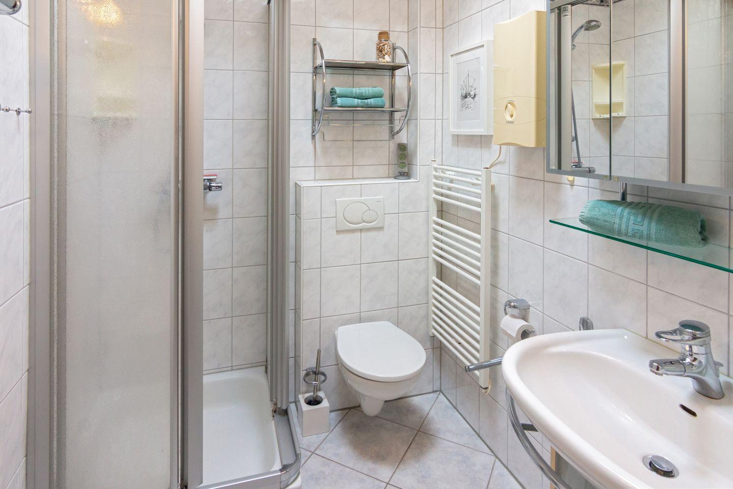 Das Bad verfügt über Dusche, WC, Fenster, Föhn. Eine Waschmaschine, Bügeleisen, Wäscheständer und Staubsauger stehen zur Verfügung.