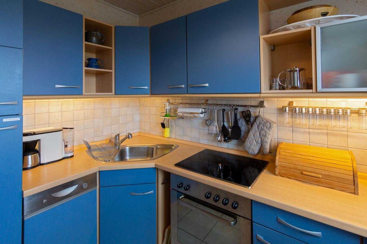 Die separate Küche ist voll ausgestattet – mit Ceranherd, Backofen, Mikrowelle, Kühlschrank mit Gefrierfach, Geschirrspüler, Kaffeemaschinen (Filter & Senseo), Toaster, Wasserkocher, Mixer u.v.m. Ein Essbereich lädt zu gemeinsamen Mahlzeiten ein.
