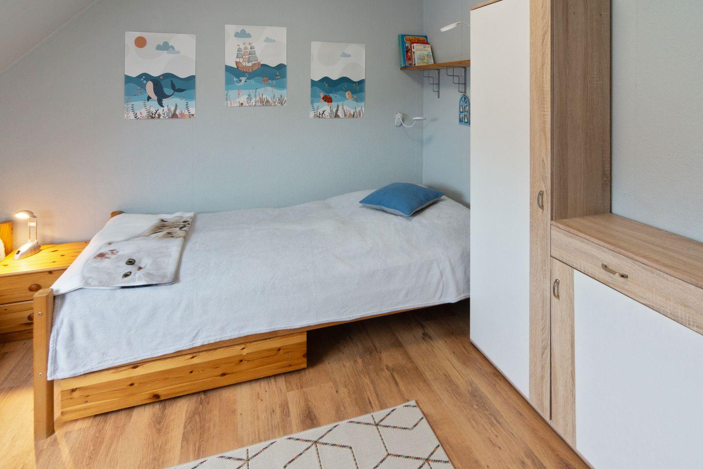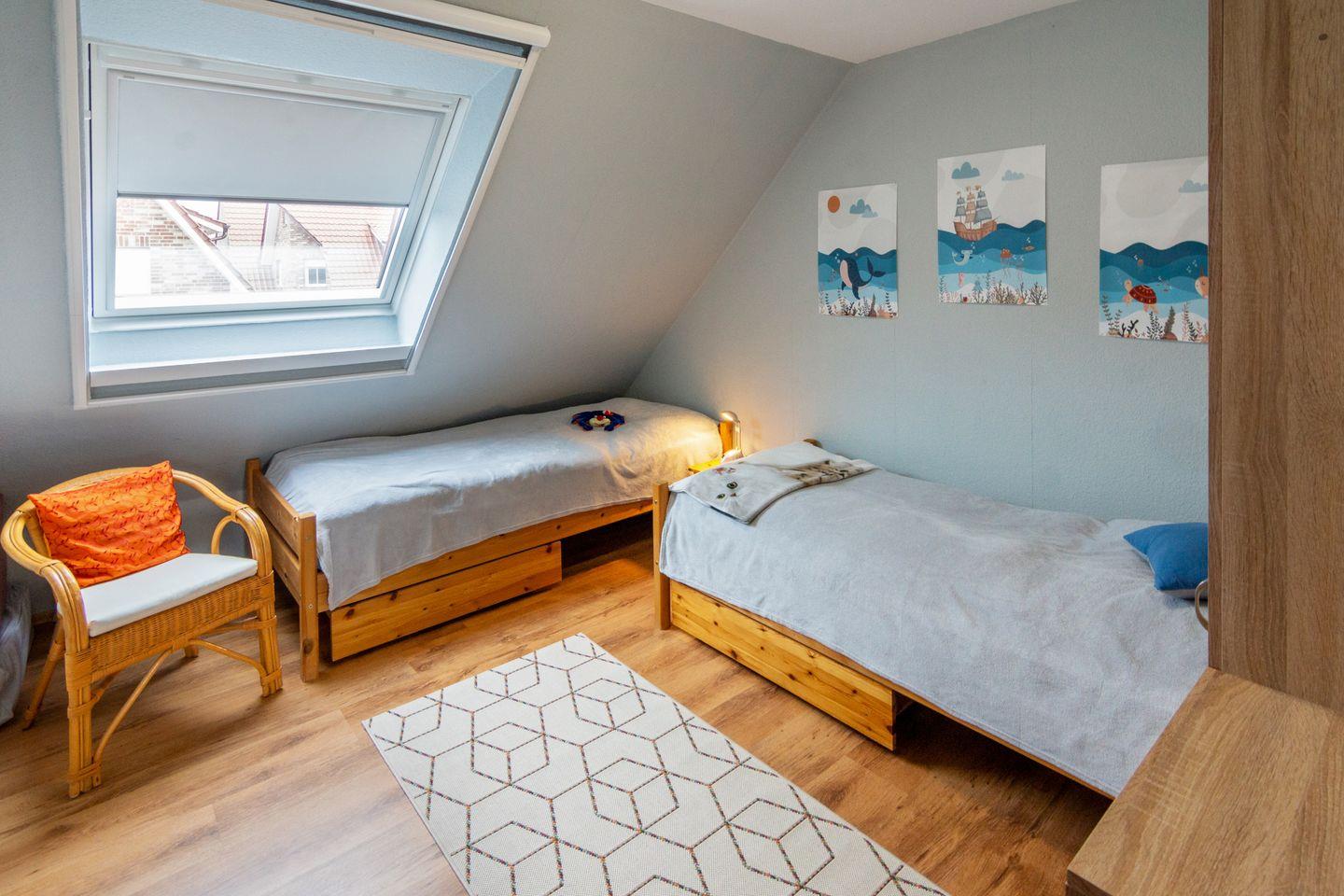 Die Wohnung umfasst drei Zimmer, darunter zwei Schlafzimmer mit Laminatböden. Im unteren Schlafzimmer steht ein Kinderreisebett bereit. Das zweite Schlafzimmer mit Ehebett befindet sich im ausgebauten Dachgeschoss, erreichbar über eine schmale Treppe. Der helle Wohnbereich ist offen gestaltet, mit Sitzecke, Essbereich und einem Balkon mit Gartenmöbeln und Sonnenschirm für entspannte Stunden.
