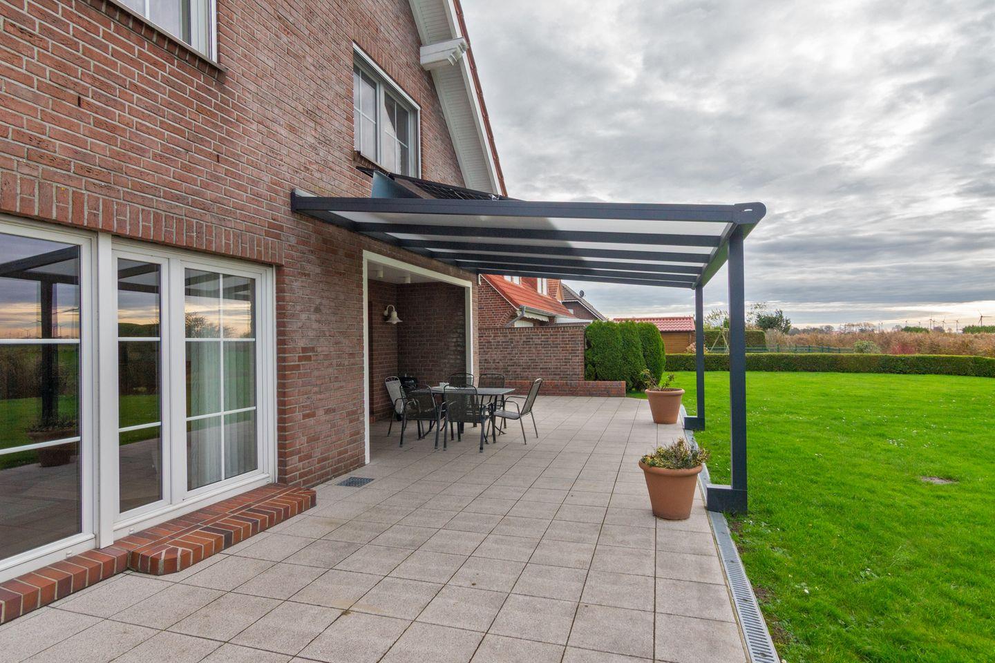 Draußen laden Terrasse mit Gartenmöbeln, großzügiger Garten mit Blick auf Wiesen und Felder, drei Privatparkplätze und eine Garage als Fahrradabstellraum zum Verweilen ein.