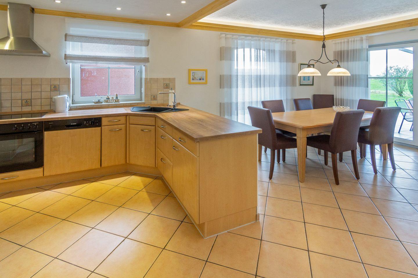 Die separate Küche ist vollständig ausgestattet: Ceranherd, Backofen, Mikrowelle, Geschirrspüler, Kühlschrank mit Gefrierfach, Kaffeemaschine, Toaster, Mixer u.v.m. Hochstuhl und Babybett stehen Familien zur Verfügung. Waschmaschine, Trockner und Bügelutensilien ermöglichen einen rundum entspannten Aufenthalt.