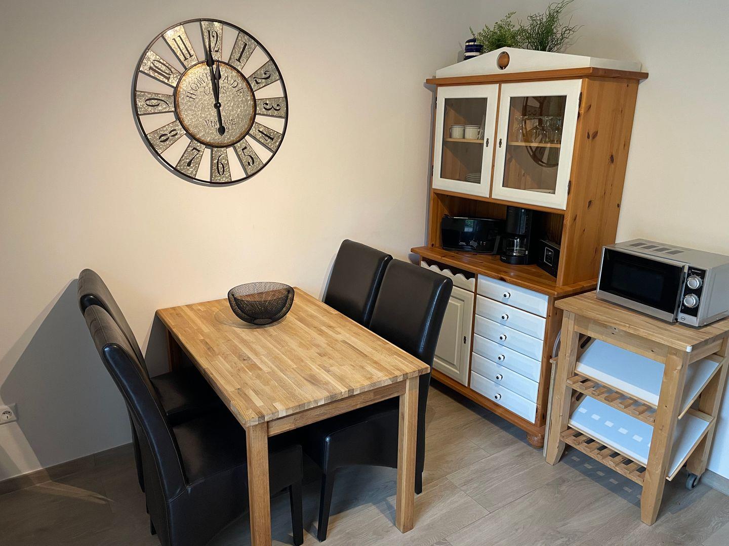 Die Unterkunft erstreckt sich über zwei Etagen und wurde 2026 modernisiert. Im Erdgeschoss erwartet Sie ein großzügiges Wohnzimmer mit großem Sofa, 65 Zoll Satelliten-TV, Blu-ray-Player, WLAN sowie Büchern und Spielen. Die geschlossene, voll ausgestattete Küche mit Esstisch verfügt über Ceranfeld, Backofen, Mikrowelle, Spülmaschine, Kühl- und Gefrierschrank sowie Kaffeemaschine. Für Familien stehen Babybetten, Hochstühle, Treppengitter und Spielzeug bereit.