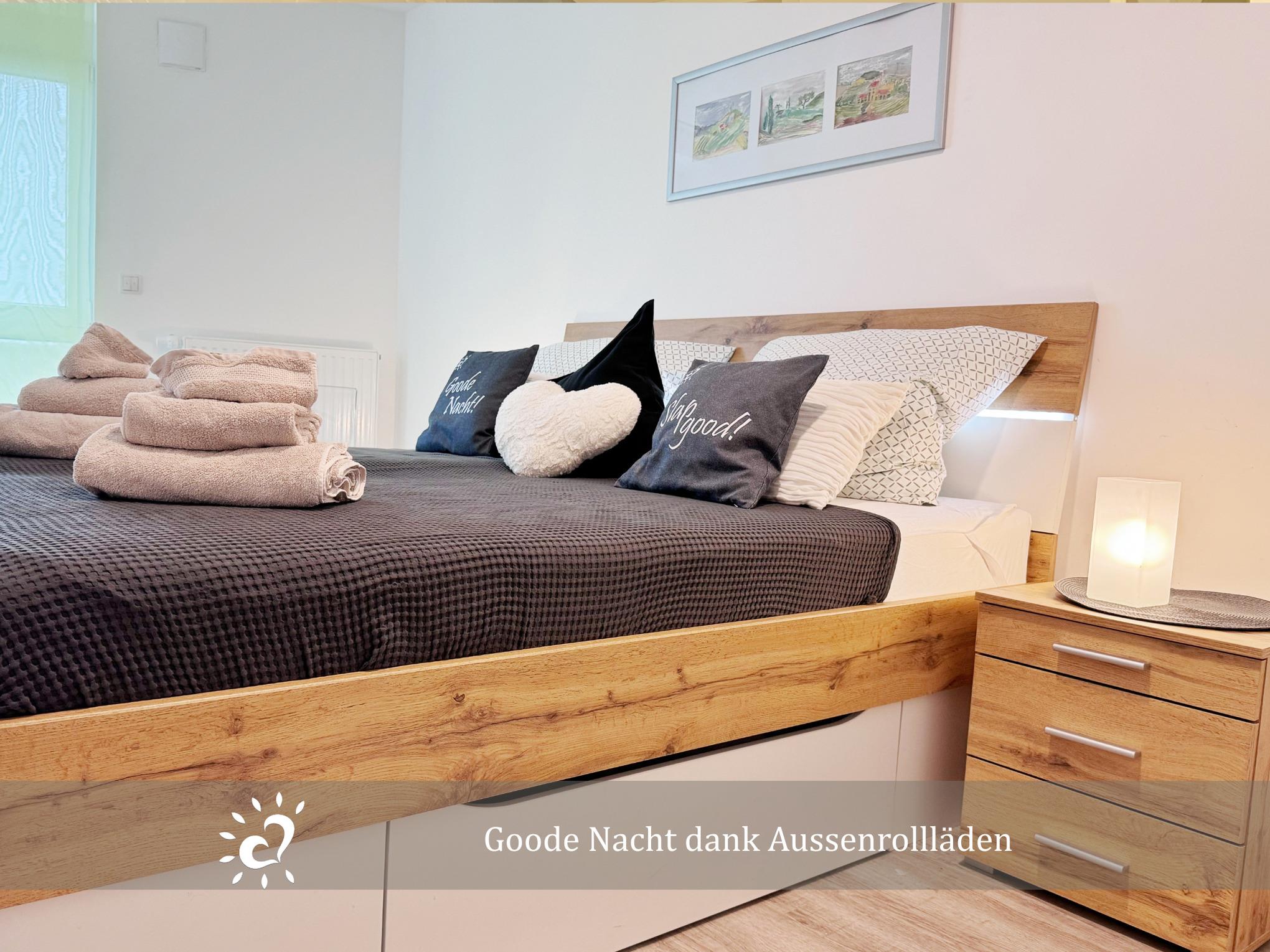 Diese modern eingerichtete Ferienwohnung bietet dir genügend Platz für 4 Personen. Zwei gemütliche Schlafzimmer – ein Doppelbett (180 x 200?cm) und ein kleines Doppelbett (150 x 200?cm) – sorgen dafür, dass du morgens ausgeschlafen und dank Außenrollläden erholt startest.