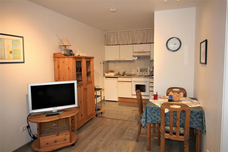 Wohnzimmer mit Essplatz. Schlafsofa 135 × 200 cm. Komplett eingerichtete Küche mit Kühlschrank und