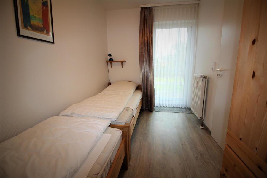 1 Schlafzimmer mit 2 Einzelbetten. Bettgröße (90 mal 190 cm - mittlerweile mit offenen Fußenden). Kinderreisebett und Kleiderschrank. Kinderhochstuhl.