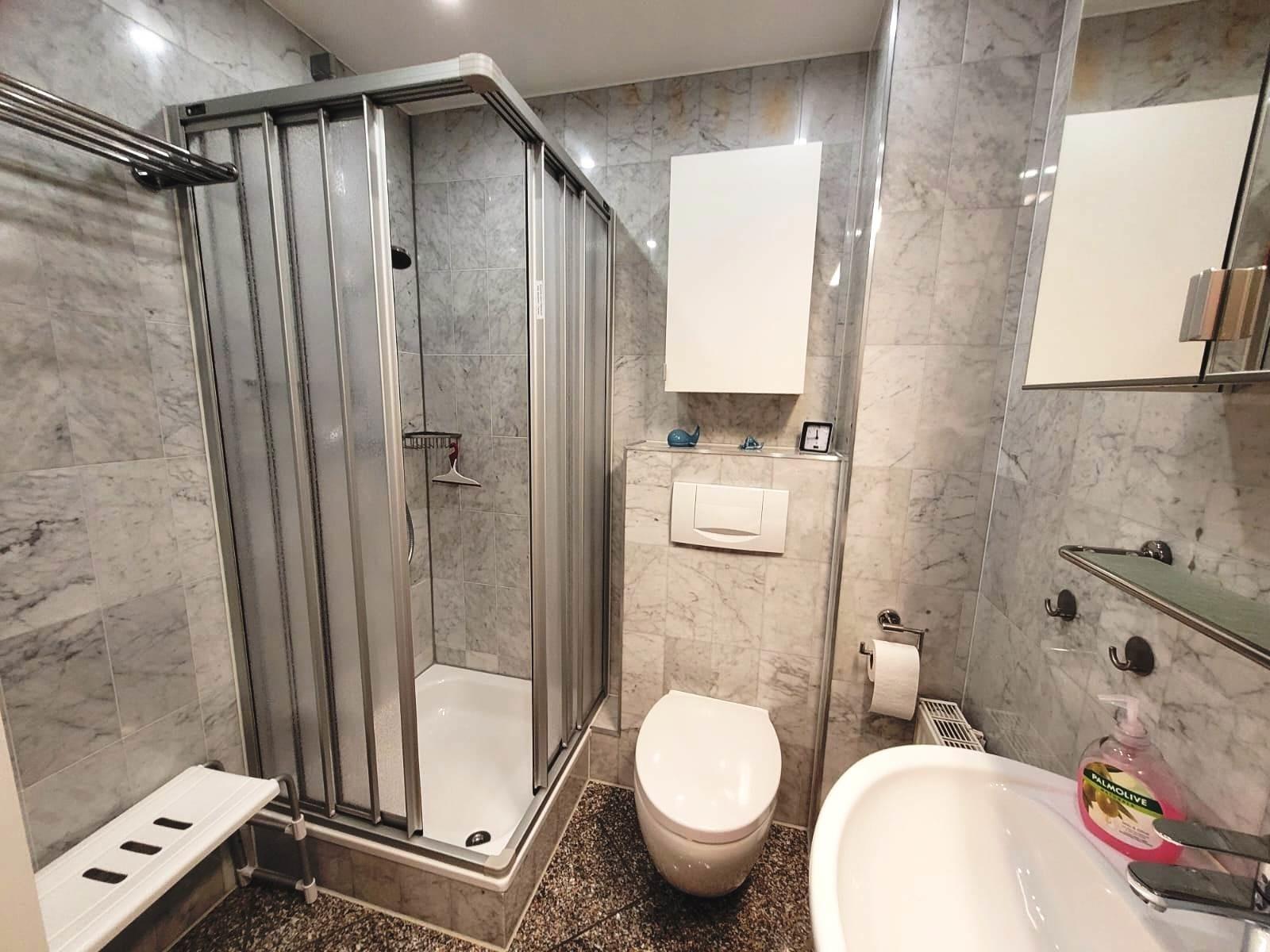 Marmorbad mit Dusche/WC, Föhn und Kosmetikspiegel, Duschstuhl und genügend Ablagen