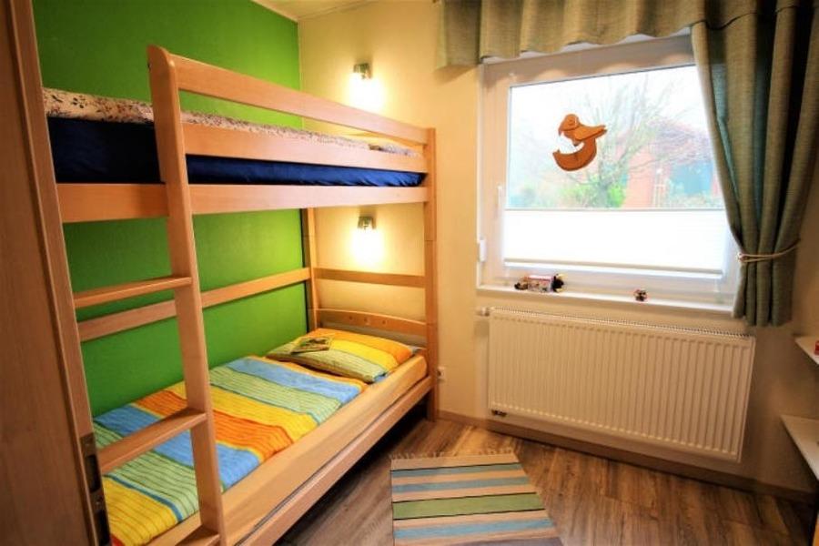 Das Elternschlafzimmer verfügt über ein Doppelbett (Bettengröße ca. 160 cm mal 200 cm) mit zwei Einzelmatratzen, ein Gästezimmer mit Hochbett (Liegefläche jeweils ca.90 mal 200 cm). Beide Schlafräume verfügen jeweils über einen Einbaukleiderschrank.