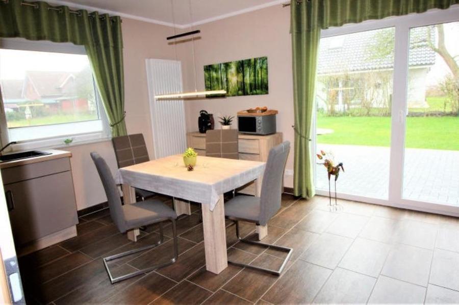 Vom großzügigen Wohn-Essraum geht es direkt zur Terrasse. Die Küche ist komplett eingerichtet - Geschirrspüler, Geschirr für 8 Personen, Kochtöpfe, Backofen, Kühlschrank mit Gefrierfach, Kaffeeautomat, Tassimo, Wasserkocher, Toaster, Mixer....