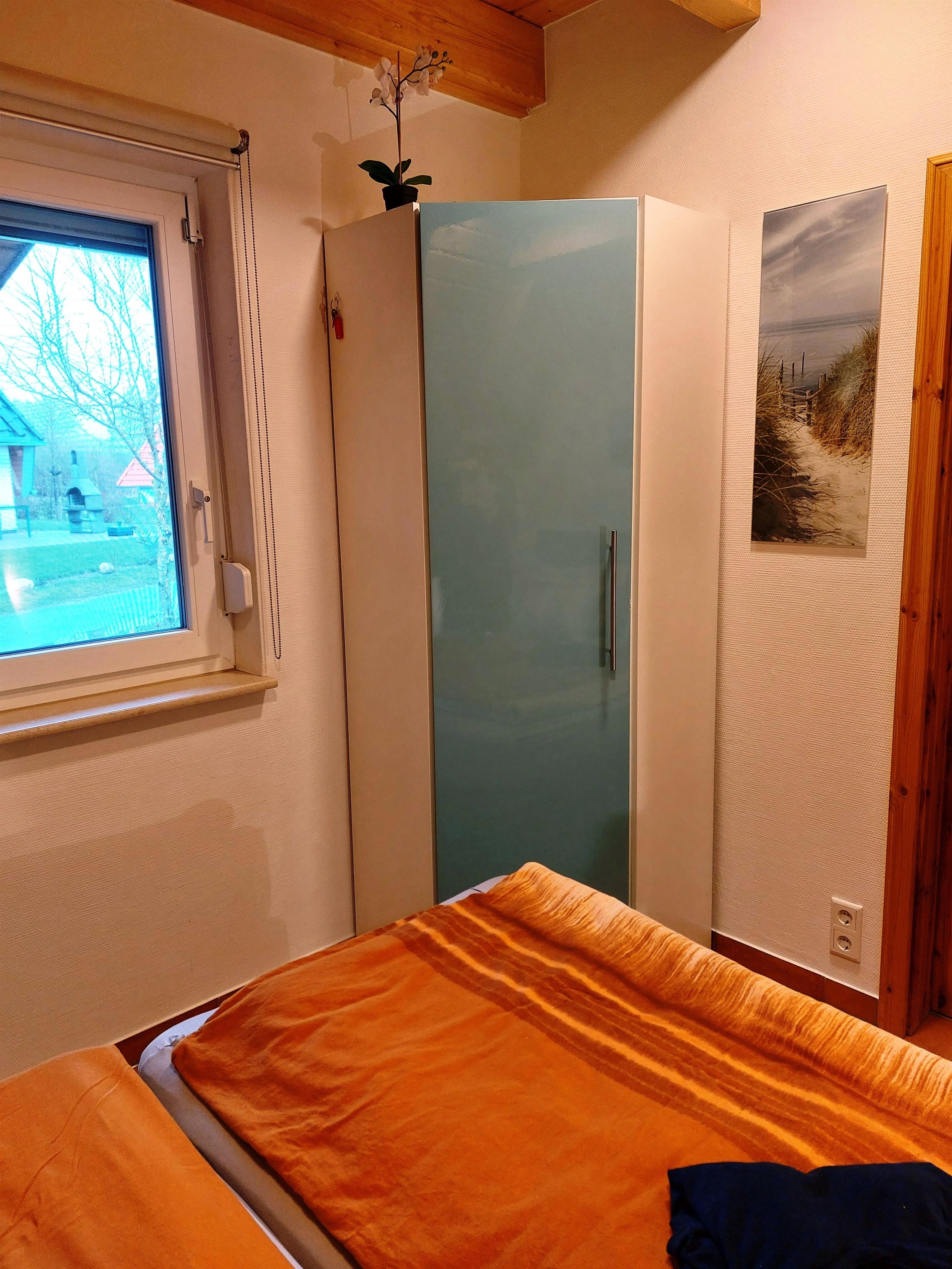 Im Obergeschoss befinden sich zwei weitere Schlafräume mit einem Doppelbett und zwei Einzelbetten, sowie das Gäste-WC. Für die Kindersicherheit sind zur Treppe nach oben Kindergitter oben und unten angebracht.