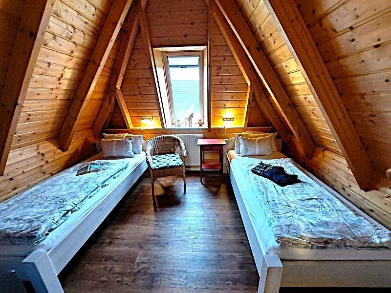 Im Obergeschoss befinden sich 2 weitere Schlafzimmer mit einem Doppelbett ( 160 x 200 cm mit 2 Einzelmatratzen) und TV, im 2. Schlafzimmer stehen 2 Einzelbetten ( 90x200 cm). Auch diese Zimmer sind mit Rollläden zur 100% Verdunkelung ausgestattet. Zusätzlich befindet sich ein weiteres WC mit Waschgelegenheit im Obergeschoss.