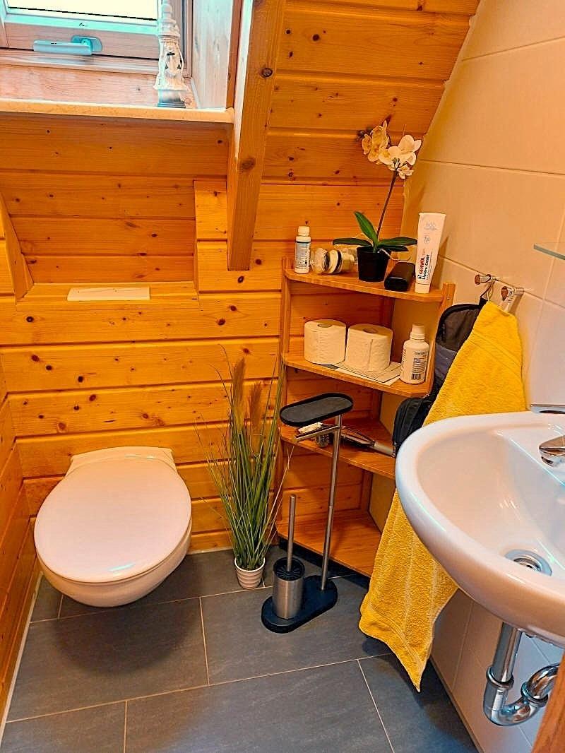 Aufgeteilt im Erdgeschoss mit einem Wohn-/Küchen-/Esszimmer mit Kamin, ein Duschbad mit bodengleicher Dusche und ein Schlafzimmer mit Doppelbett (160 x 200 cm mit 2 Eintelmatratzen ). Die Fenster sind mit Rollläden zur 100% Verdunkelung und Insektenschutz ausgestattet. Für den Kamin ist Kaminholz mitzubringen und der Kamin ist bei Abreise gereinigt zu hinterlassen