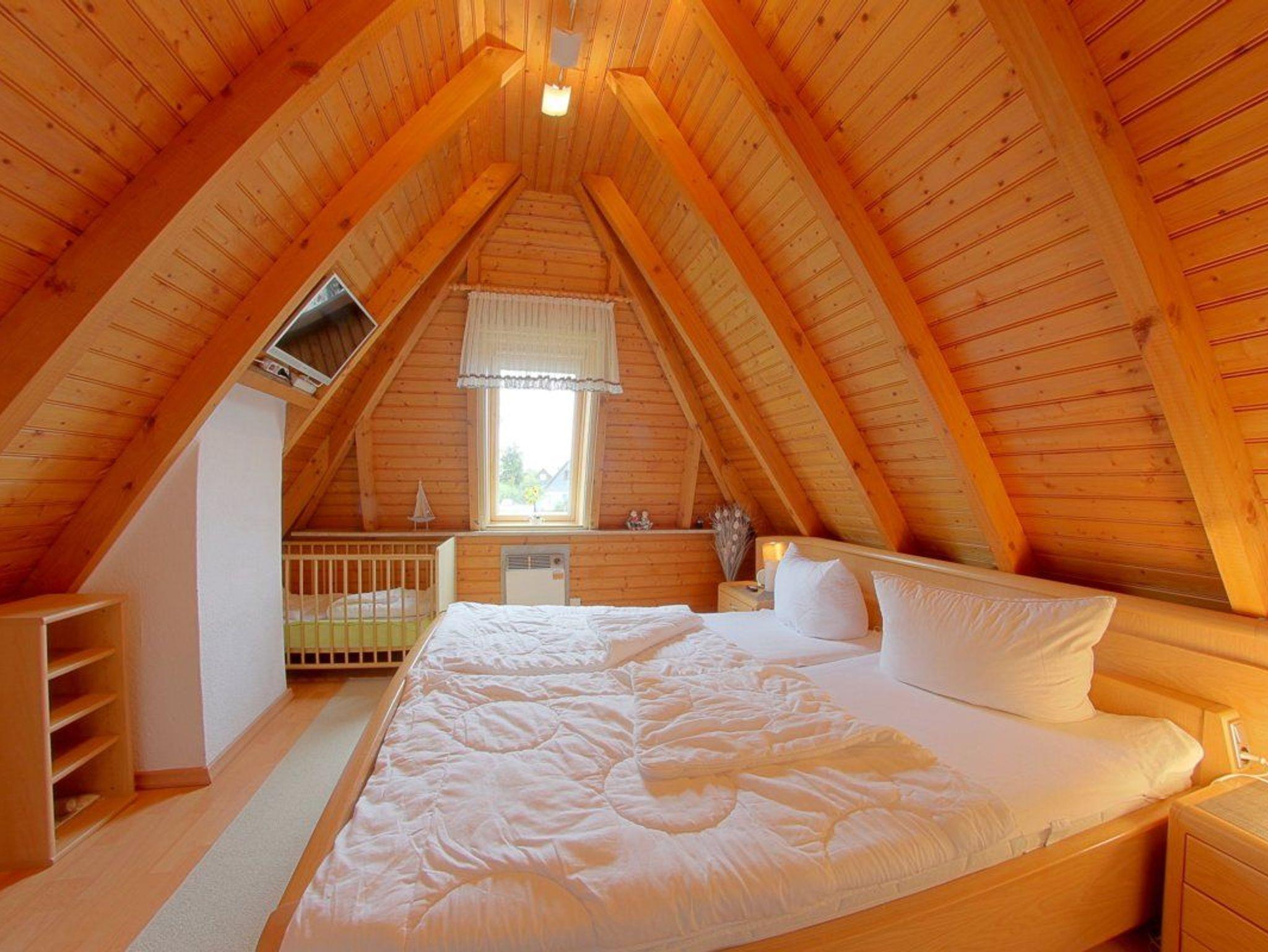 Im Obergeschoss befinden sich 2 Schlafzimmer, eines mit Doppelbett, Babybett und TV und Verdunkelung incl. Fliegengitter.