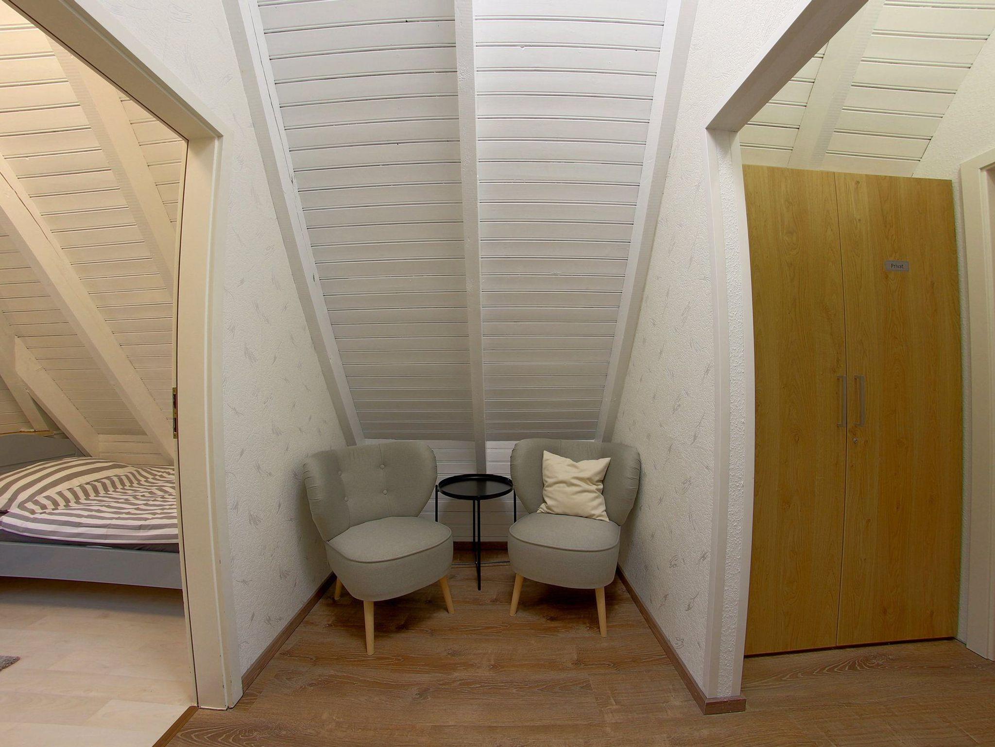 Die Schlafräume sind durch einen kleinen Aufgang mit gemütlichen Sesseln verbunden, die zum lesen und Verweilen einladen.