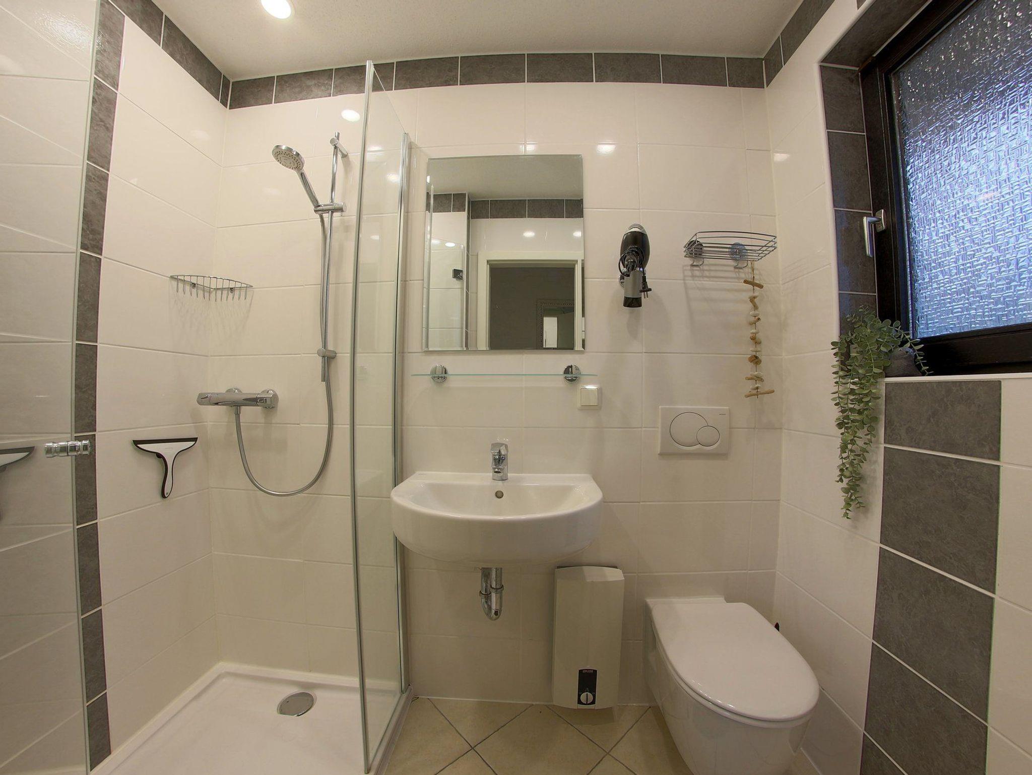 Ein Badezimmer im EG mit geräumiger, ebenerdiger Dusche und großen Waschbecken mit Spiegelschrank und Fön sowie Toilette