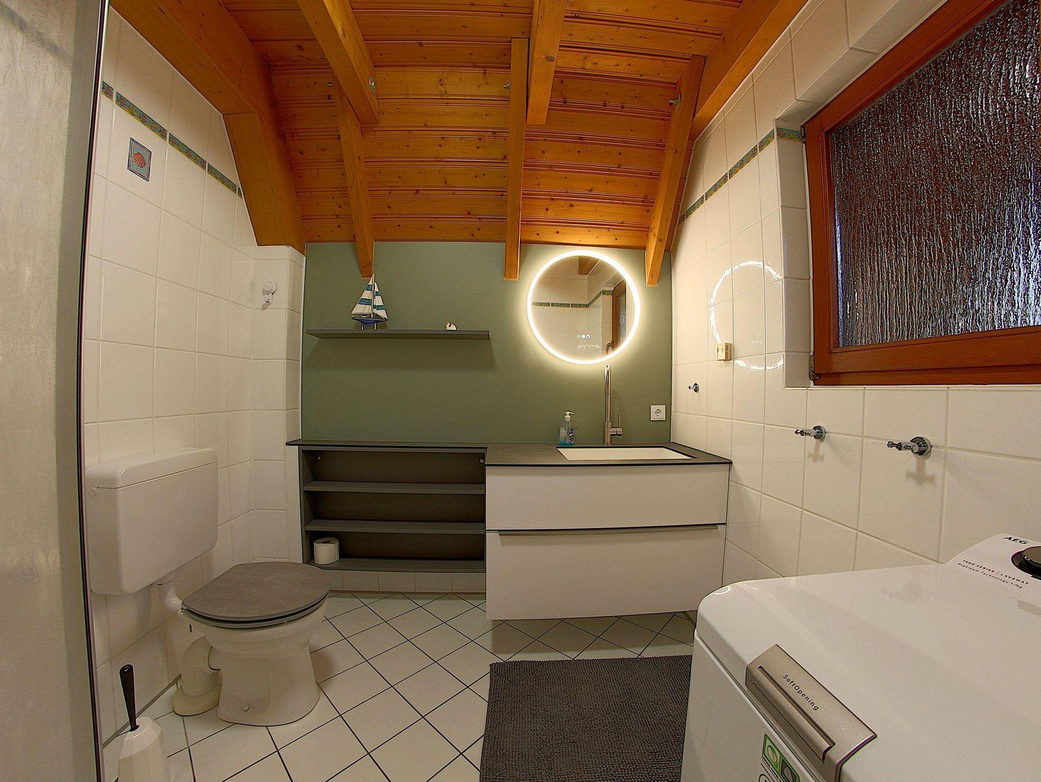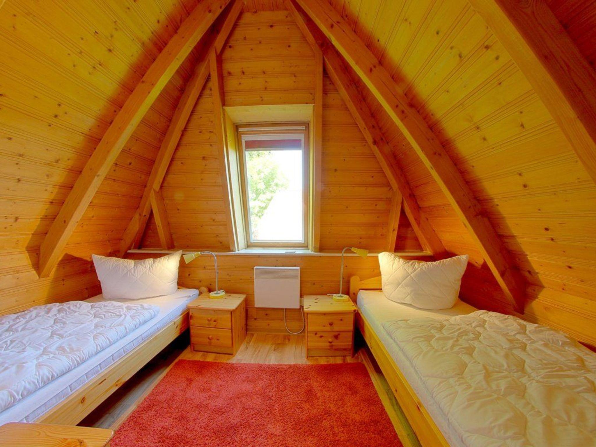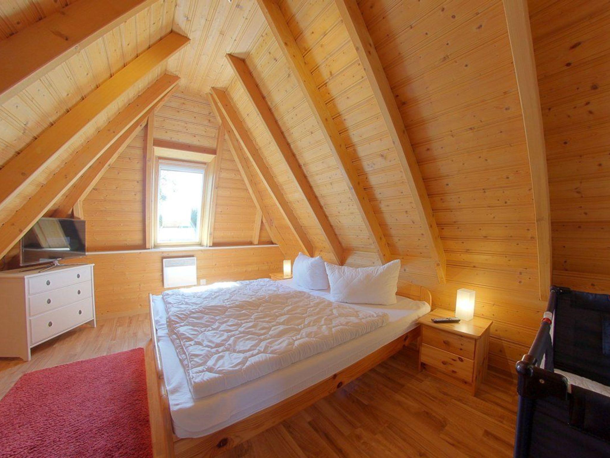 Im Obergeschoss befinden sich zwei Schlafzimmer mit einmal Doppelbett, TV und Babyreisebett und eins mit zwei Einzelbetten. Ebenfalls befindet sich ein WC im Obergeschoss. Das Obergeschoss ist mit hellem eldlen Holz vertäfelt und PVC Boden ausgestattet.