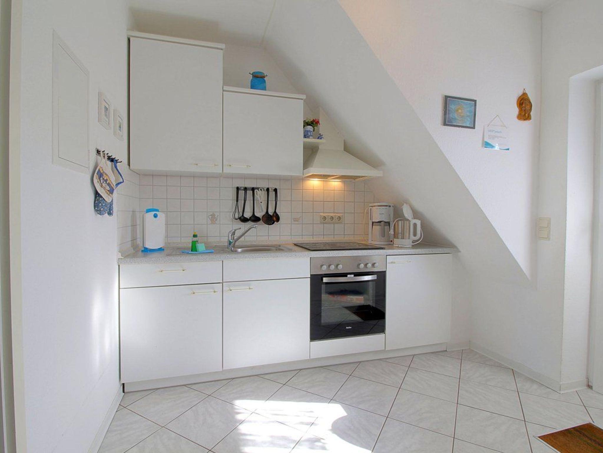 Gemütliche Nichtraucher- Ferienwohnung mit Wohn- und Essbereich mit Ausgang zum Balkon, separate Küche und einem Schlafraum im Spitzboden mit Doppelbett (1,60 x 2,00 m) und einem Einzelbett (0,90 x 2,00 m ). Der Wohnbereich ist komplett gefliest, Schlafbereich mit Teppichboden. Babyreisebett und Hochstuhl stehen in der Wohnung zur Verfügung.