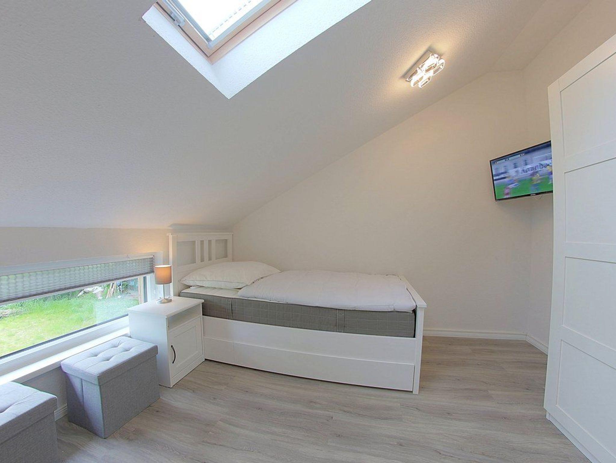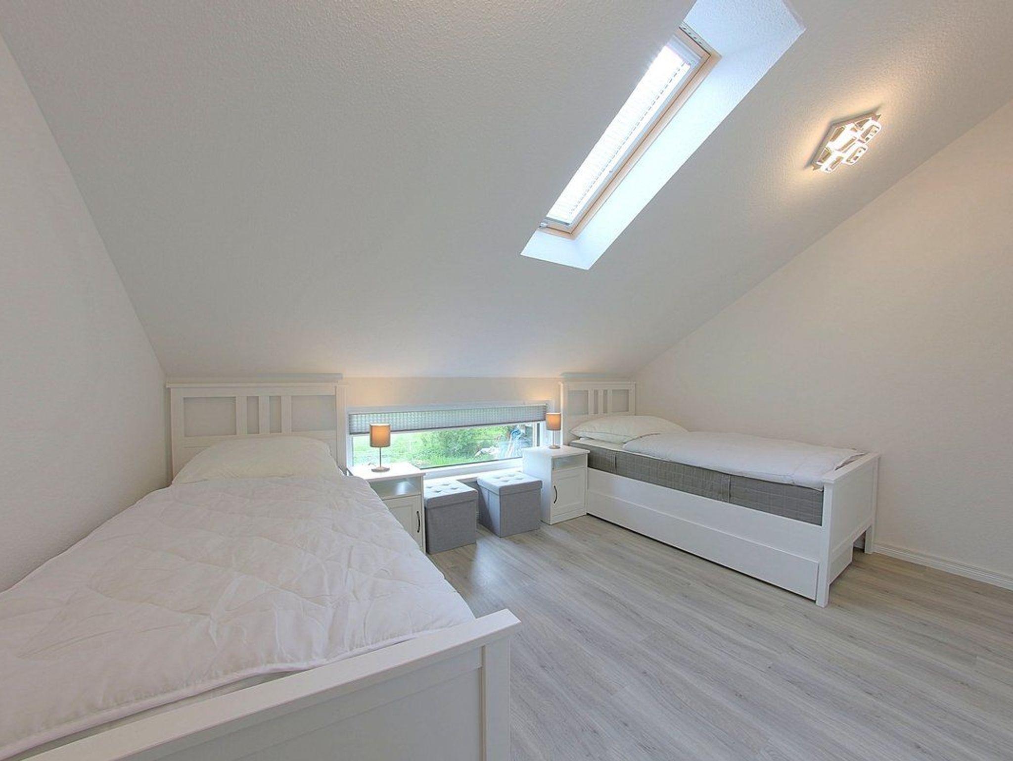 Im Obergeschoss befinden sich zwei Schlafzimmer, eins mit Doppelbett (1,60 x 2,00 m) und TV, sowie ein Schlafzimmer mit 2 Einzelbetten ( 0,90 x 2,00 m) und ebenfalls TV. Ein weiteres Schlafzimmer mit Etagenbetten ( 0,90 x 2,00 m) gibt es im Erdgeschoss.