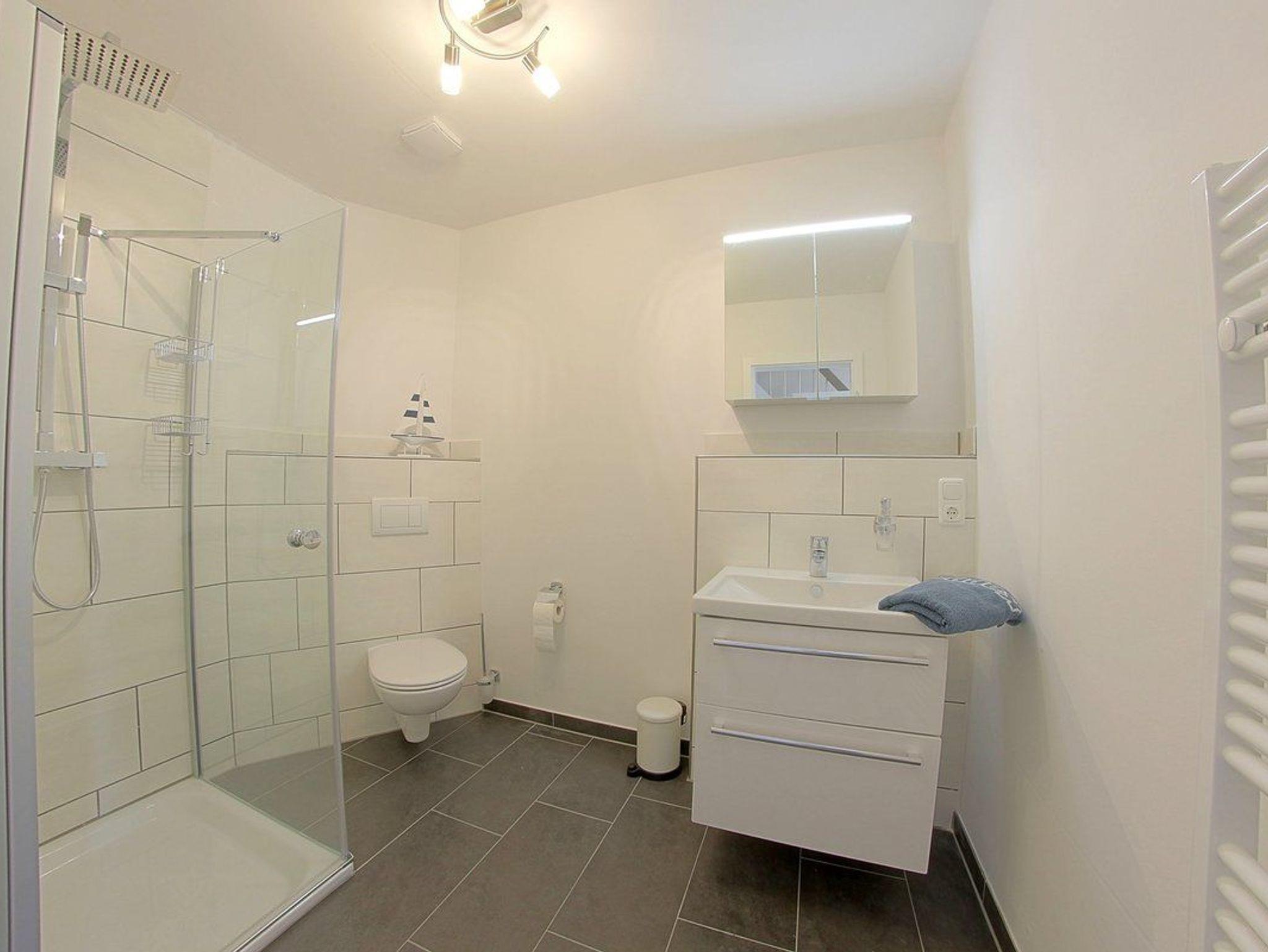 Ein helles, modernes Duschbad steht Ihnen ebenfalls im Erdgeschoss zur Verfügung und im Obergeschoß ein separates WC.