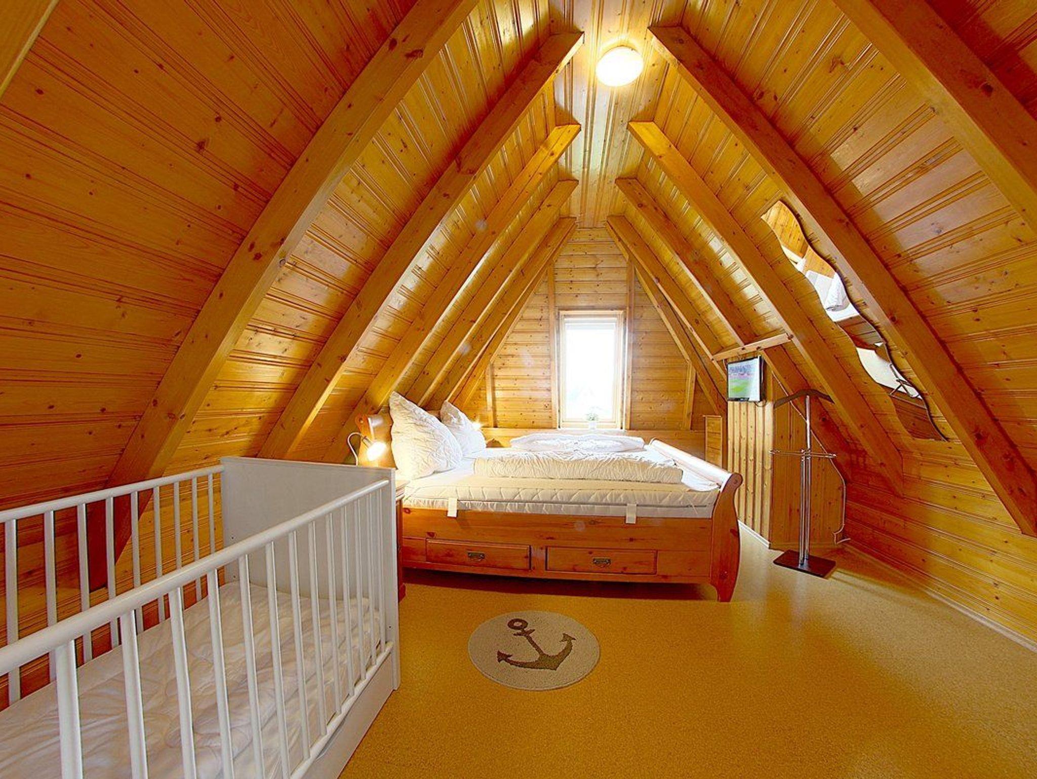 Im Obergeschoss befinden sich ein Schlafzimmer mit Doppelbett, Babybett und TV, sowie ein Schlafzimmer mit zwei Einzelbetten.