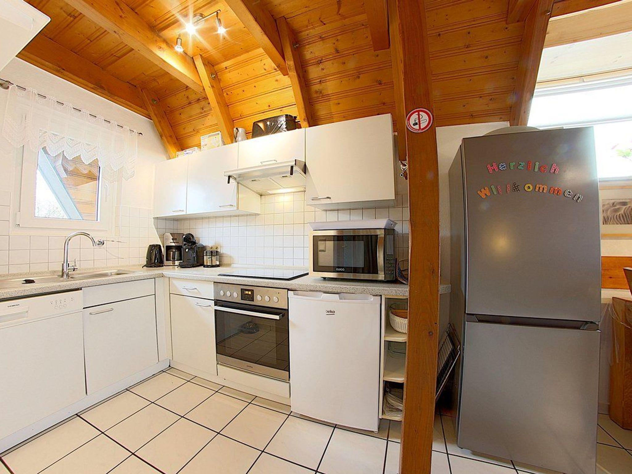 Im modern gestalteten, im Erdgeschoss komplett gefliesten Haus gibt es einen offenen Wohnbereich mit Flat-TV, Kaminofen für die kältere Jahreszeit, Essplatz und Küche mit komplett ausgestatteter moderner Einbauküche. Vom Wohnraum aus geht es direkt auf die Terrasse.