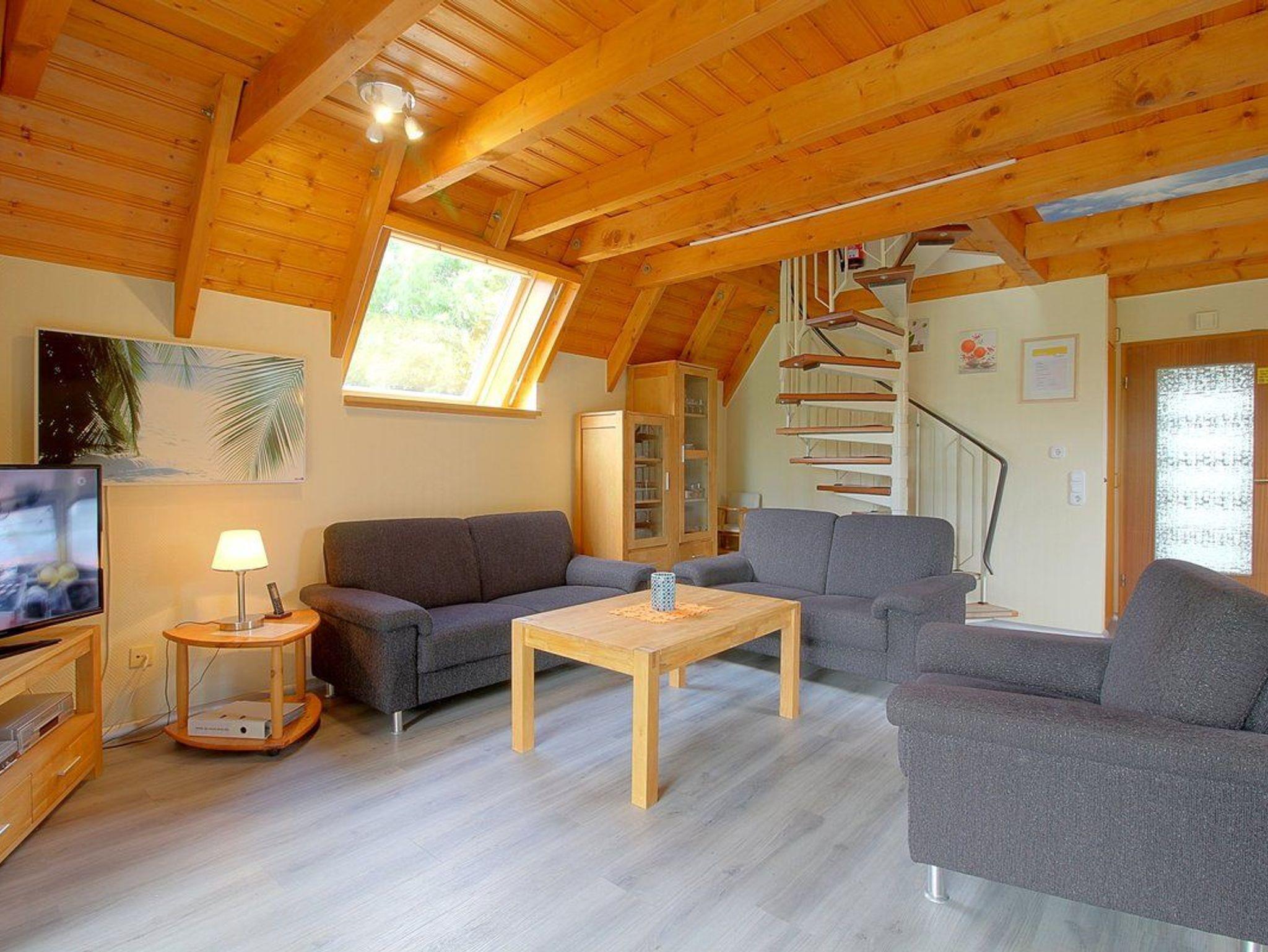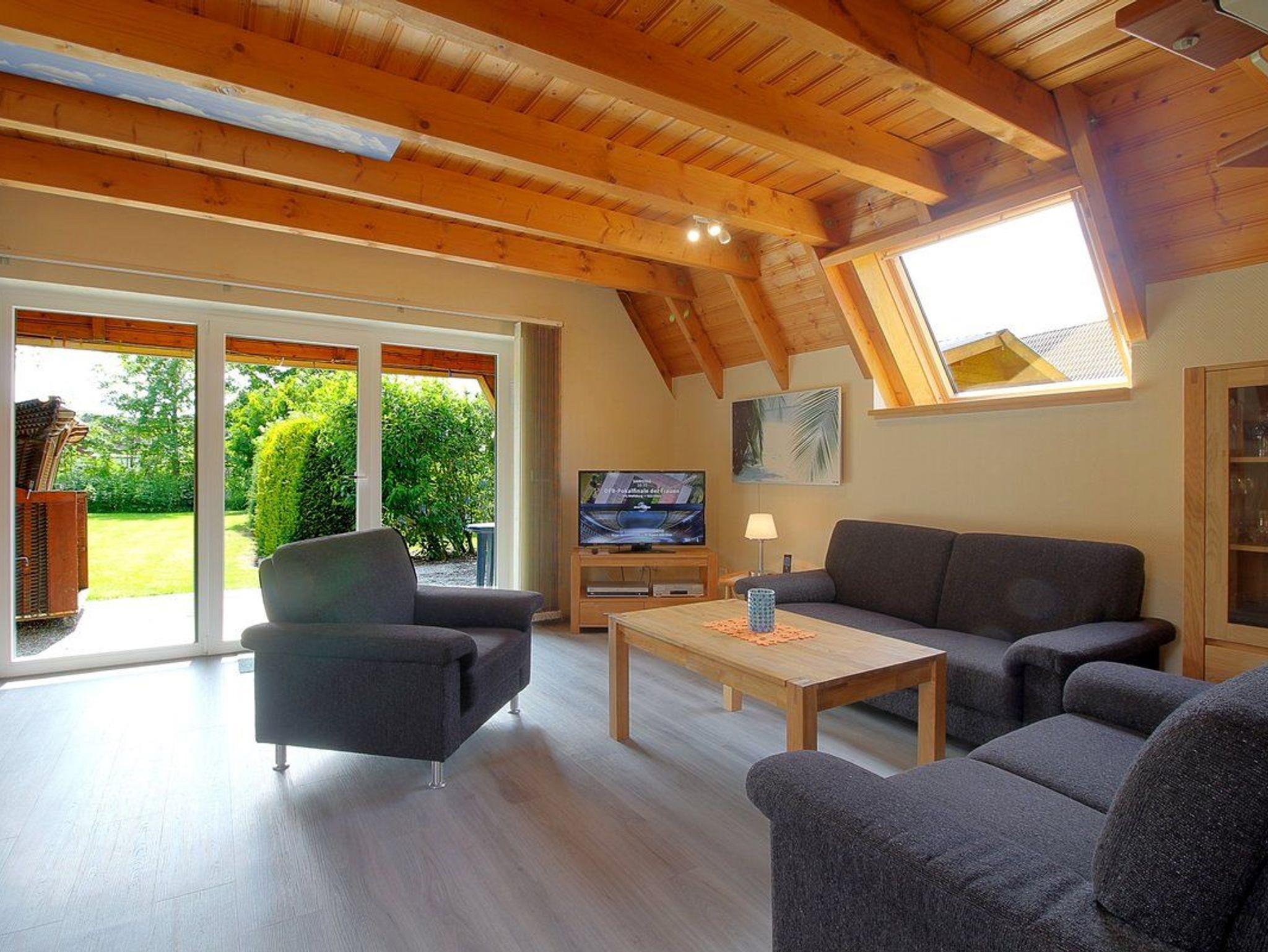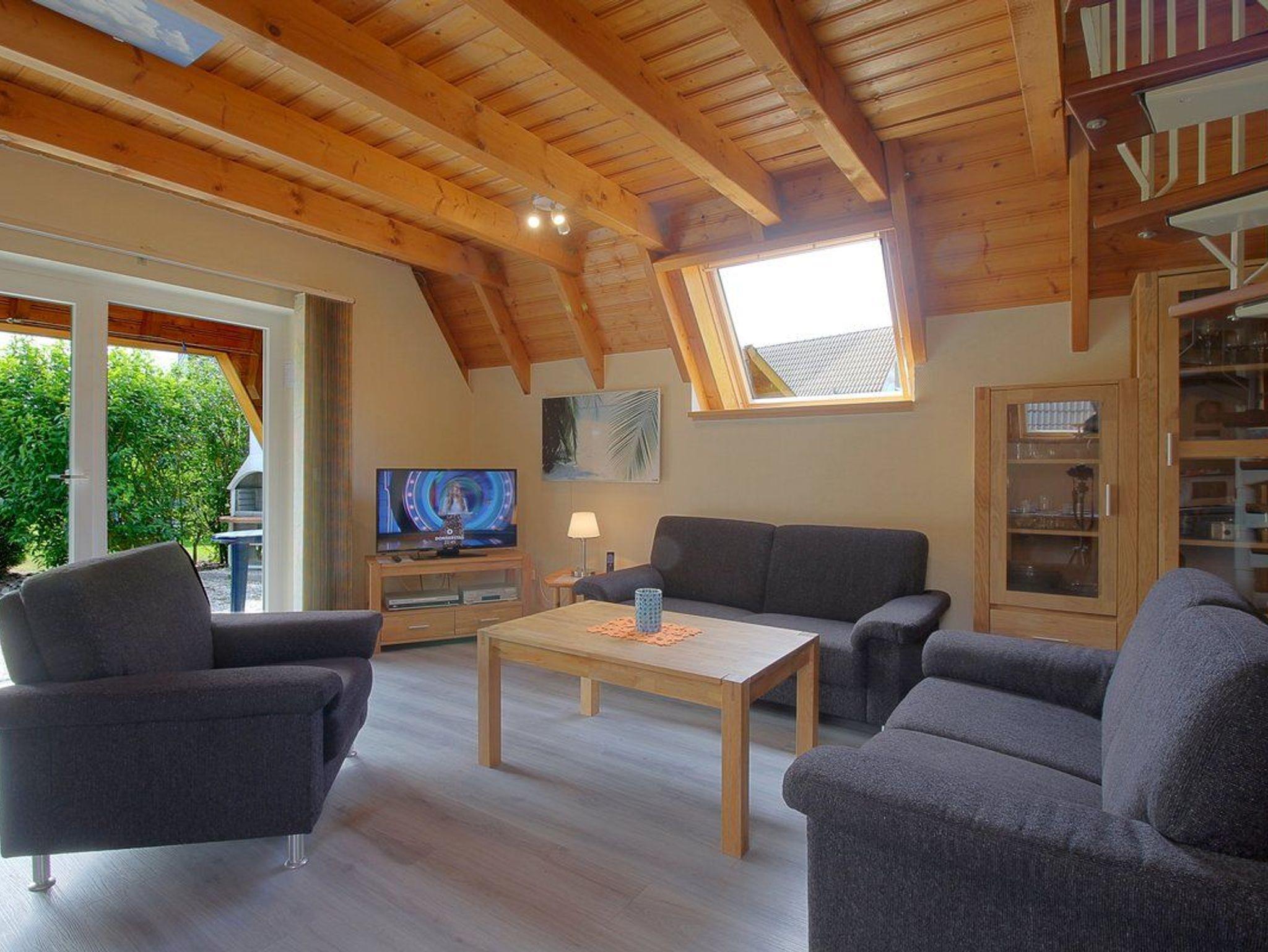 Das Haus verfügt über einen offenen Wohn-, Ess- und Küchenbereich im Erdgeschoss. Der Wohnbereich ist mt Vinylboden ausgestattet. Kaminofen, Flachbild-TV, Stereoanlage, VHS-Player, kostenloses Internet und eine sonnige Terrasse mit Gartenmöbeln und Strandkorb stehen Ihnen hier zur Verfügung.