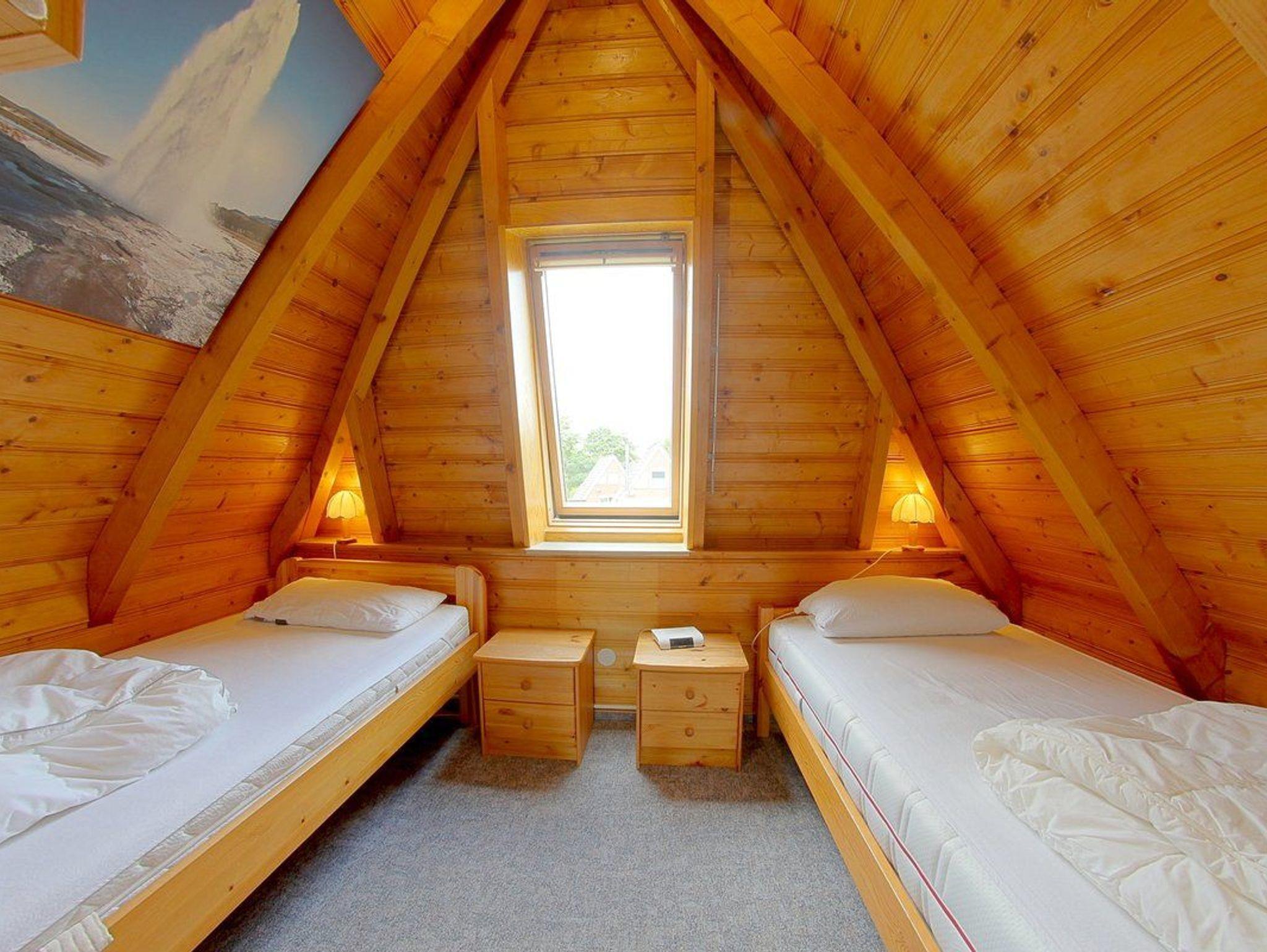 Die Schlafräume befinden sich im im Obergeschoss und sind mit Teppichboden versehen. Elternschlafzimmer mit Doppelbett, TV und Babyreisebett und Kinderzimmer mit 2 Einzelbetten, auch für Erwachsene geeignet (100 x 200 cm). Verdunklungsmöglichkeiten in allen Räumen. Desweiteren ein zusätzliches WC im Obergeschoss.