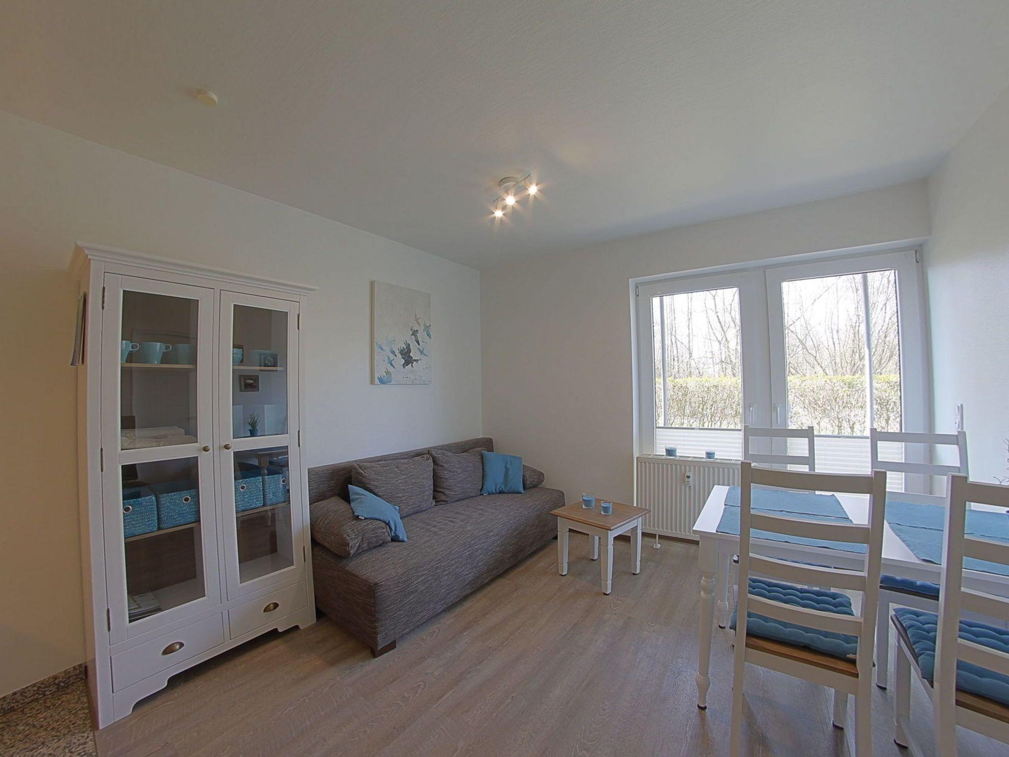 Komfortabel ausgestattete Ferienwohnung im Erdgeschoss mit 1 Schlafraum mit Doppelbett (1,60 x 2,00 m), 2. Schlafzimmer, 1 Einzelbett (0,90 x 2,00 m) mit Ausziehbett und 1 Babyreisebett. Küchenzeile und Wohnraum mit Ausgang zur gemütlichen Terrasse. Die Wohnung ist mit Vinylbelag ausgelegt und daher auch für Allergiker geeignet